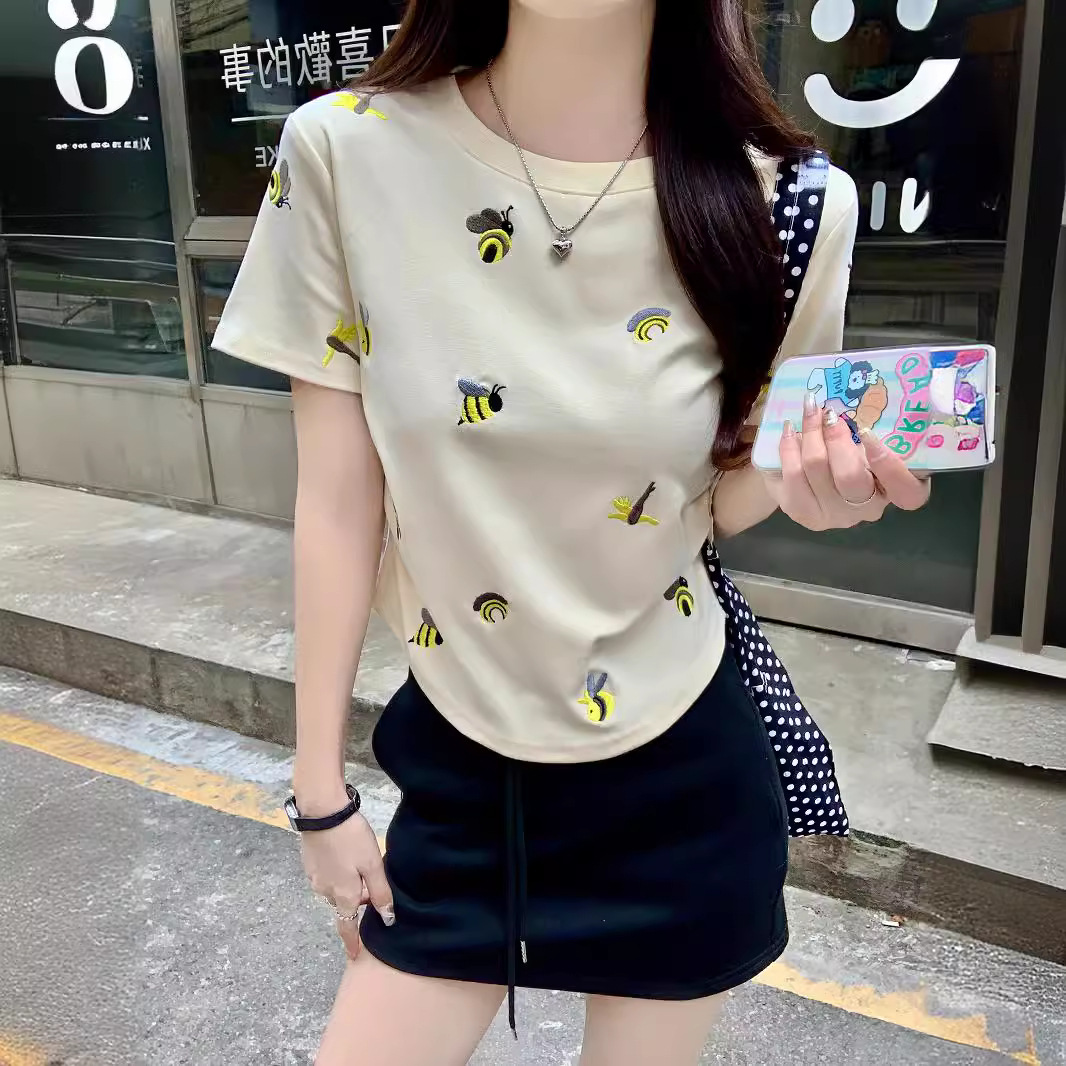 重工别致小蜜蜂刺绣短袖T恤女夏季收腰修身百搭正肩上衣