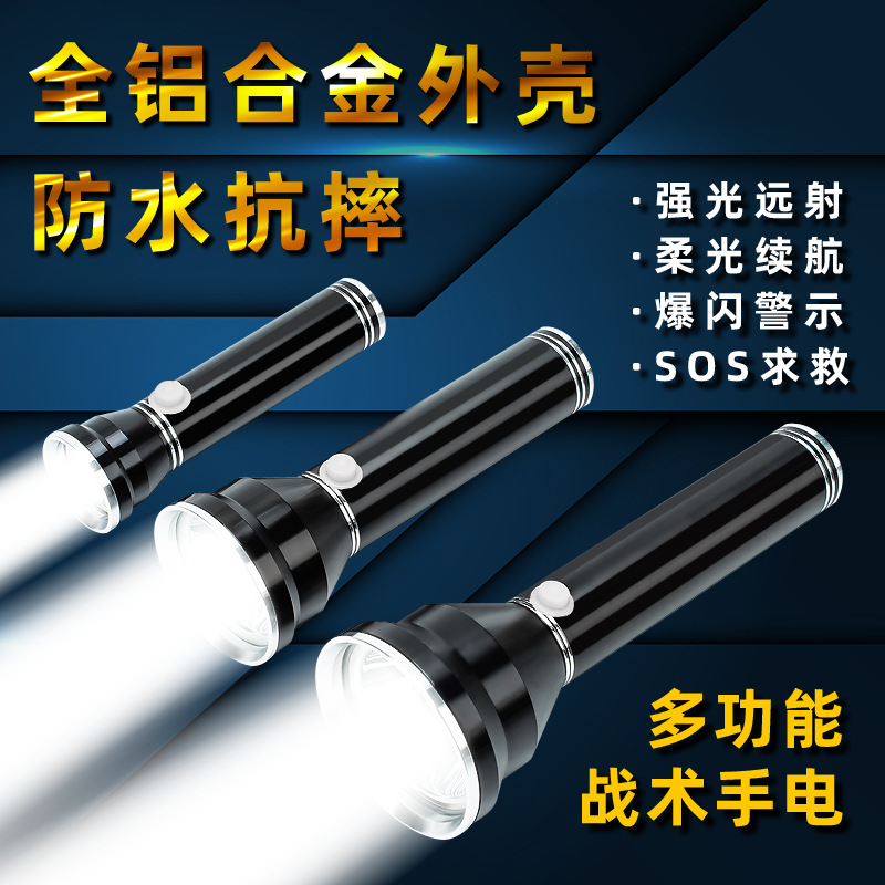 LED强光手电筒USB充电户外应急手电筒铝合金防水防汛爆闪电筒