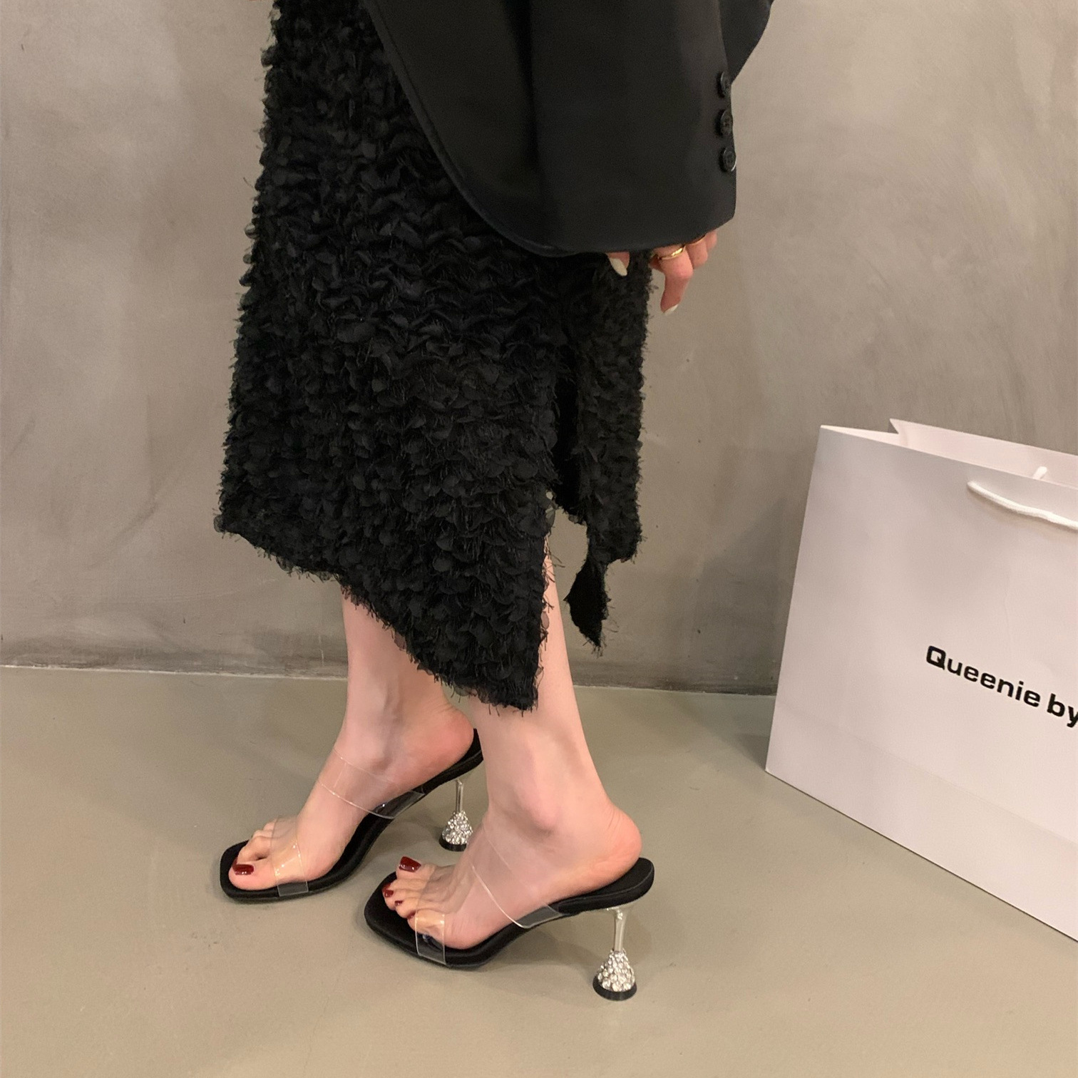 法式拖鞋女外穿新款秋季细跟方头透明一字拖高跟鞋