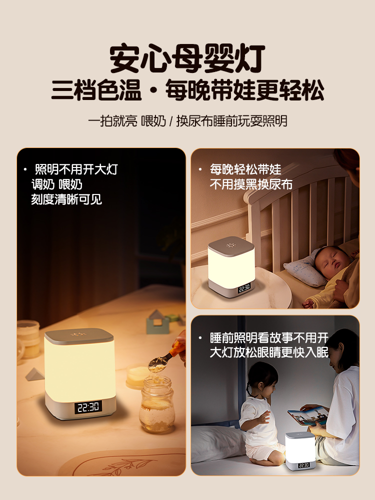 - 时钟款(时间显示+2400毫安+定时熄灭+三色光+一拍即亮)