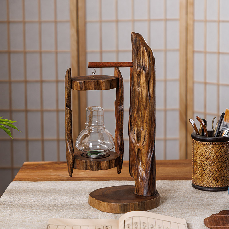 原木风灯创意烛台复古东南亚玻璃罩烛台户外防风马灯禅意摆件