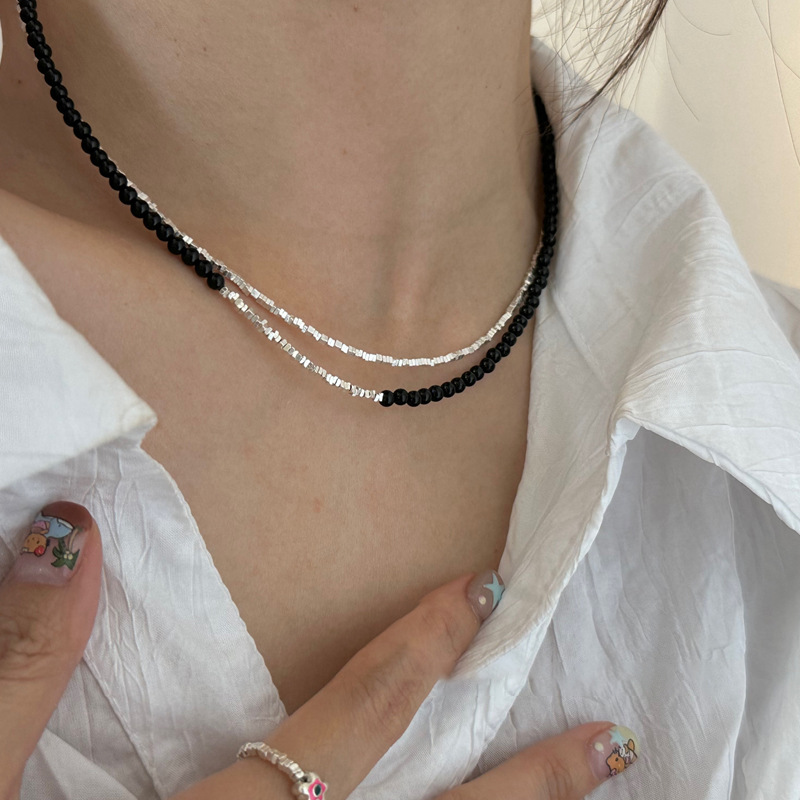 新款设计铜碎银子黑玛瑙串珠项链个性独特设计感锁骨链女通勤项链