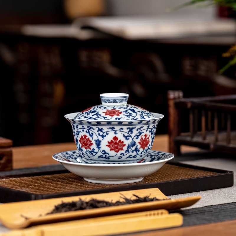 景德镇七丞堂仿古泥釉里红青花缠枝莲陶瓷三才盖碗家用功夫茶具