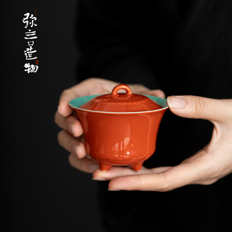 弥言故宫红创意三足鼎盖碗手工陶瓷薄胎泡茶碗不烫手功夫茶具纯色