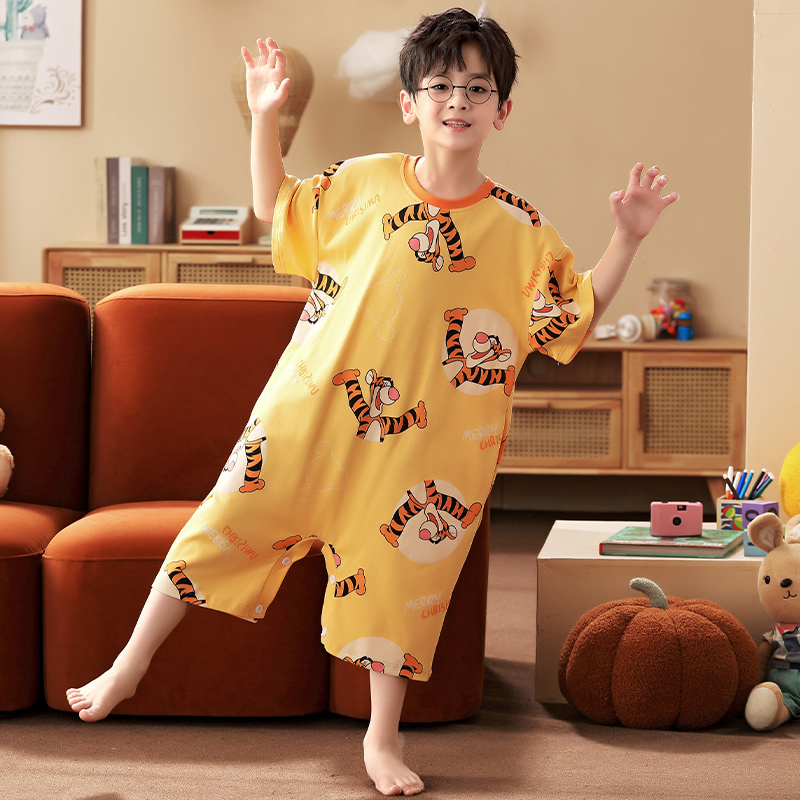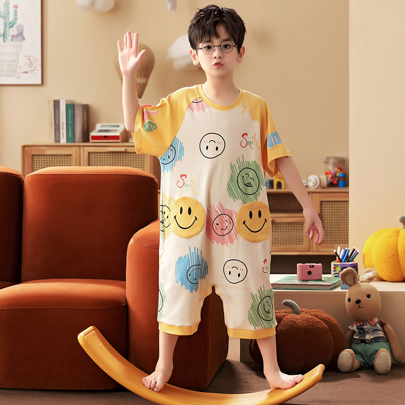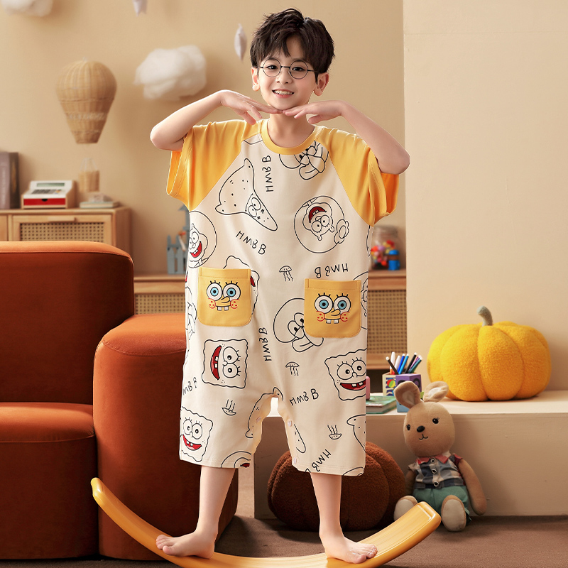 男童连体睡衣夏季纯棉短袖连体衣防踢遮肚卡通小孩儿童空调家居服