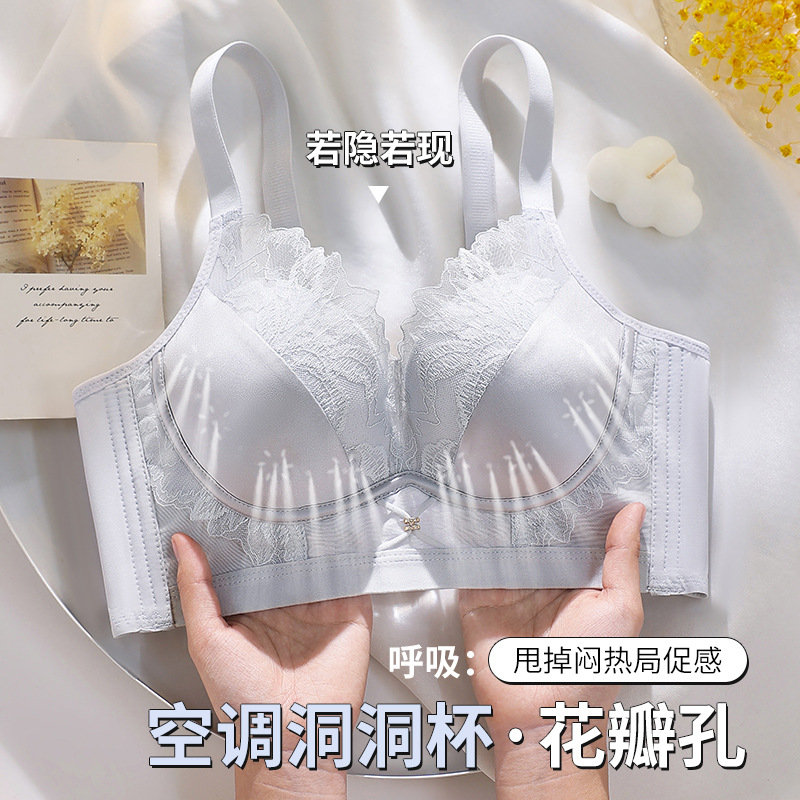高端法式缎面内衣女大胸显小空调洞洞杯无钢圈侧收光面蕾丝文胸罩