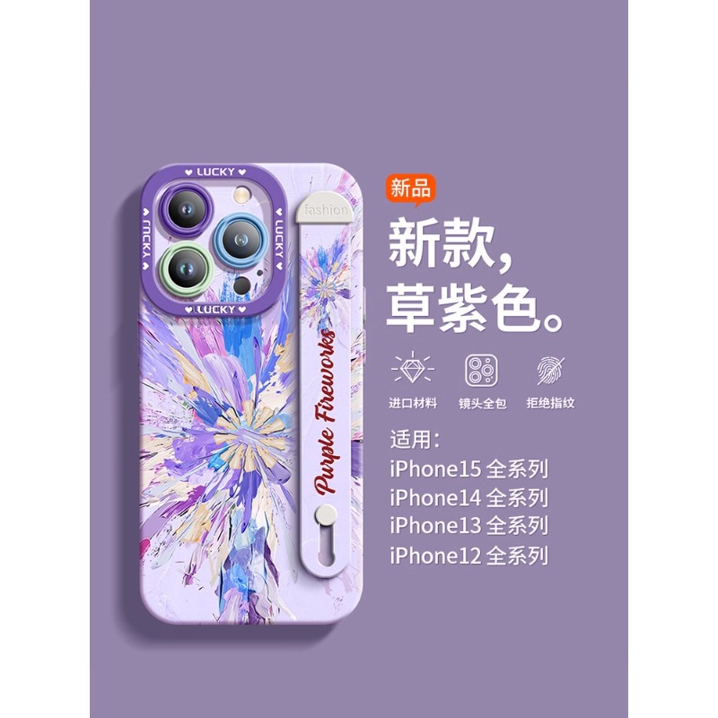 适用于苹果14puls手机壳液态油画烟火硅胶15男女全包iPhone13腕带