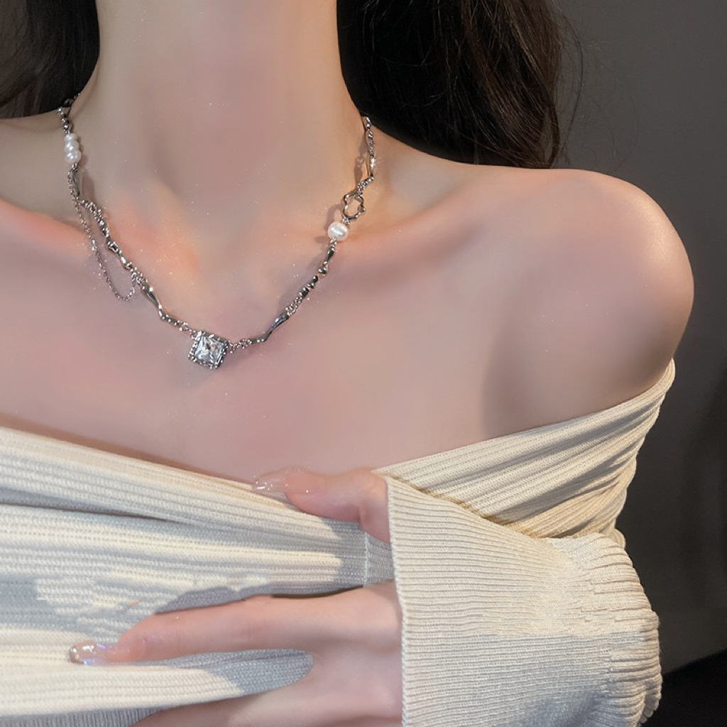 轻奢高级感黑白方形锆石水晶项链女辣妹个性甜酷风珍珠拼接锁骨链