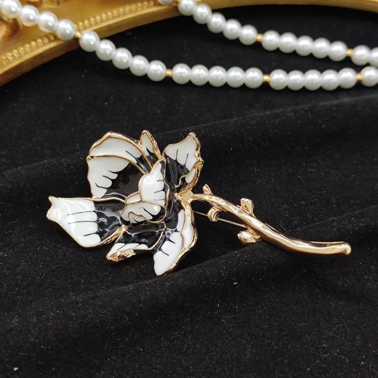 复古优雅玉兰花黑白珐琅釉胸针小众设计高级感胸花配饰简约中古风