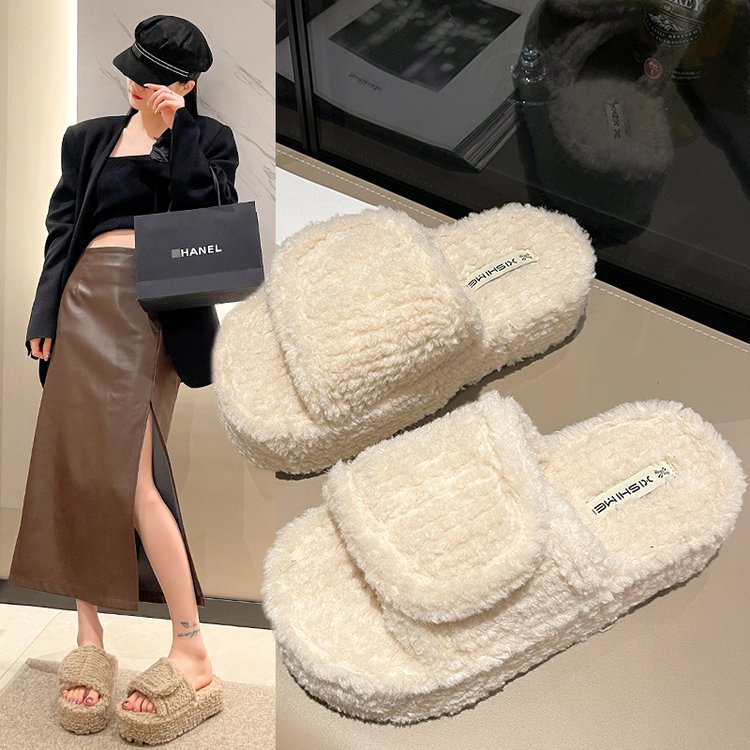 厚底一字魔术贴棉拖女外穿新款秋冬洋气舒适增高舒适毛毛拖鞋