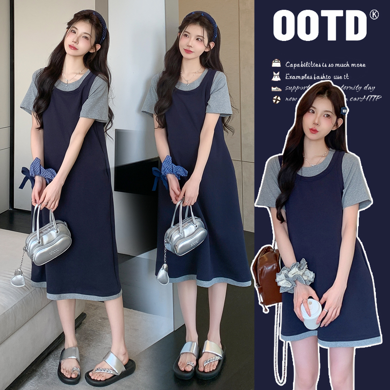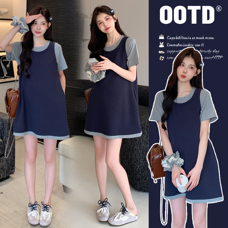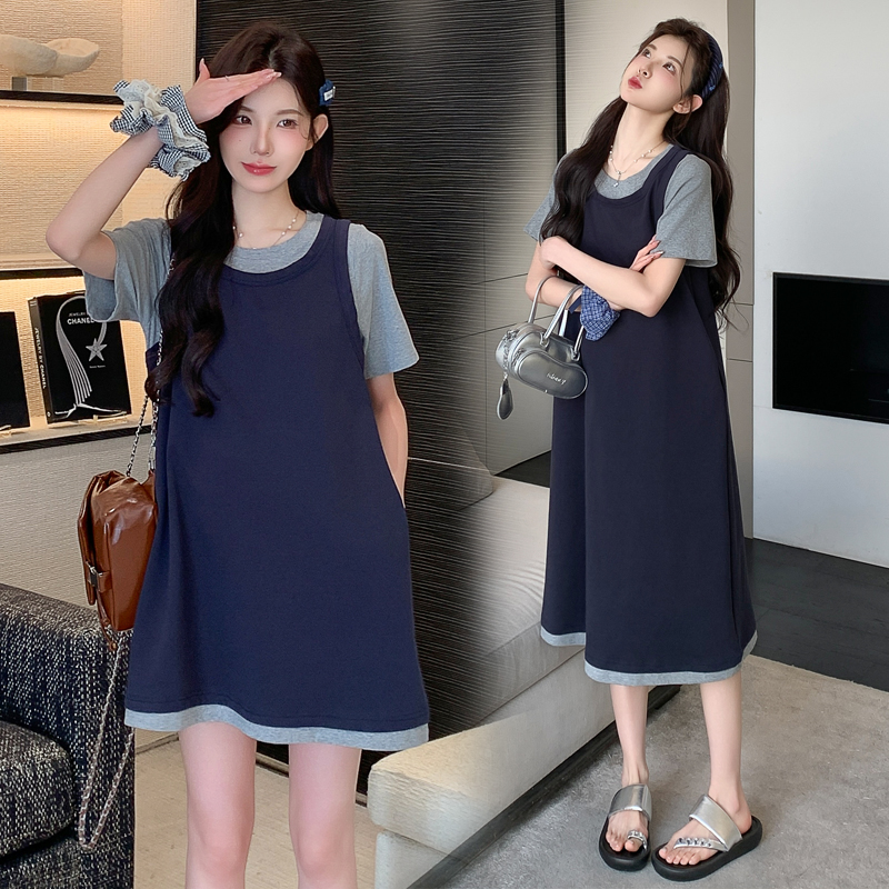 孕妇装夏连衣裙2025新款孕妈高级穿搭法式假两件针织裙夏季孕妇裙