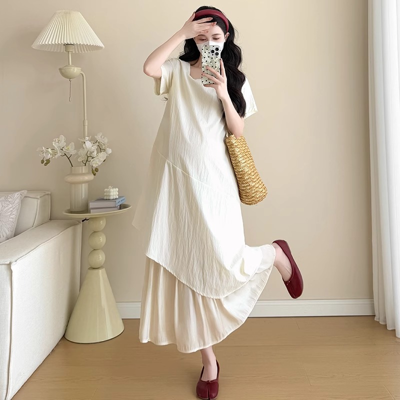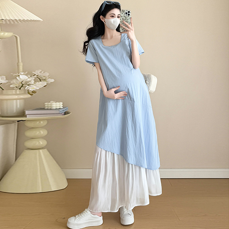 孕妇装夏连衣裙2025新款法式宽松遮肚假两件方领长裙夏季孕妇裙子