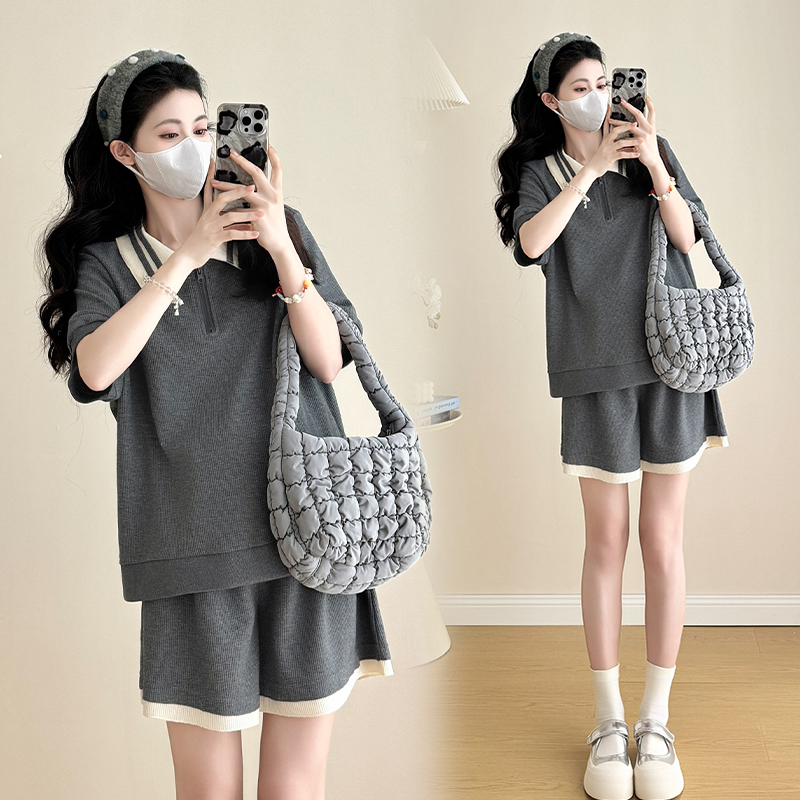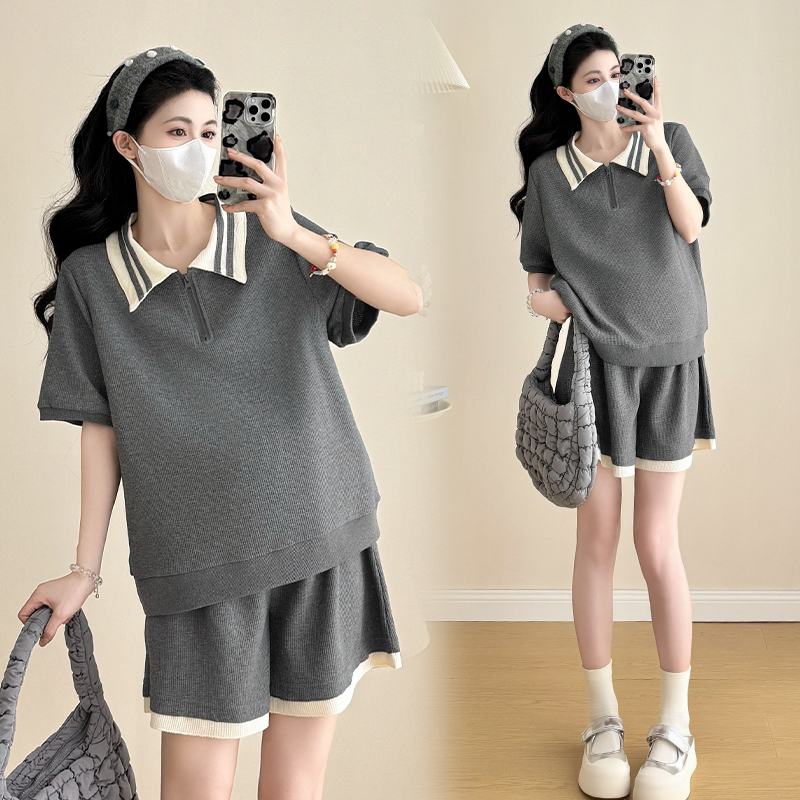 孕妇夏装洋气时髦休闲套装2025夏天新款时尚领恤上衣短裤子