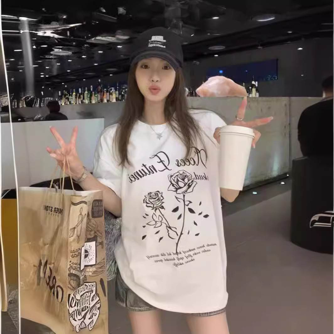 美式复古玫瑰印花短袖T恤女夏季气质宽松休闲百搭慵懒风圆领上衣