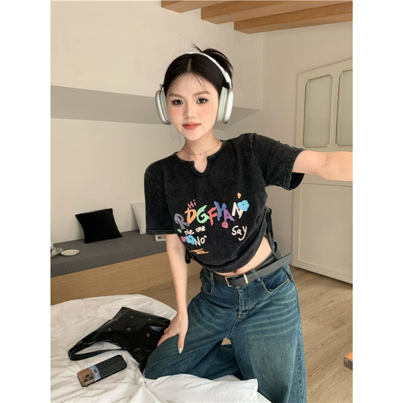 美式复古字母印花抽绳短袖T恤女装夏季做旧百搭辣妹情侣上衣