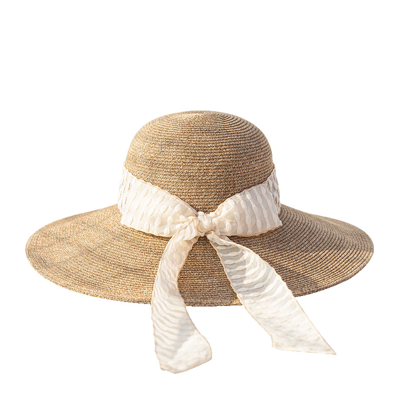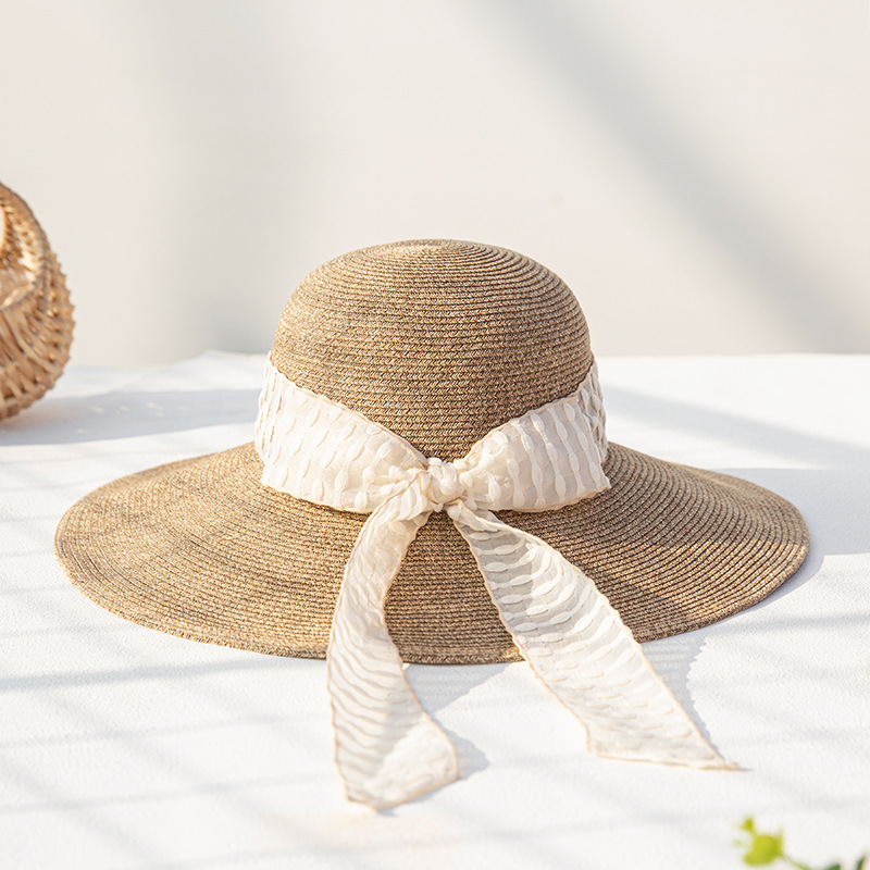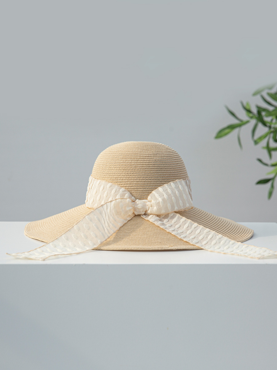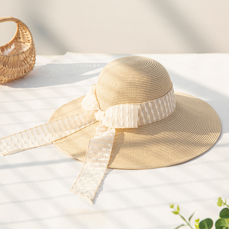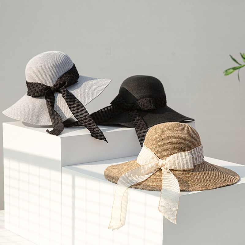 新款草帽遮阳女海边沙滩蝴蝶结飘带可折叠夏季出游太阳帽