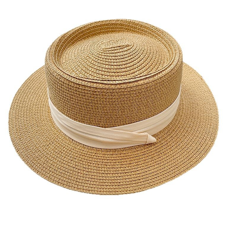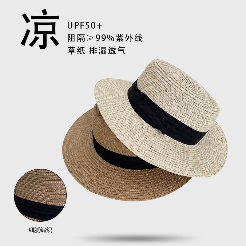 草编帽子女夏季平顶草帽大帽檐防晒遮阳帽礼帽海边沙滩帽
