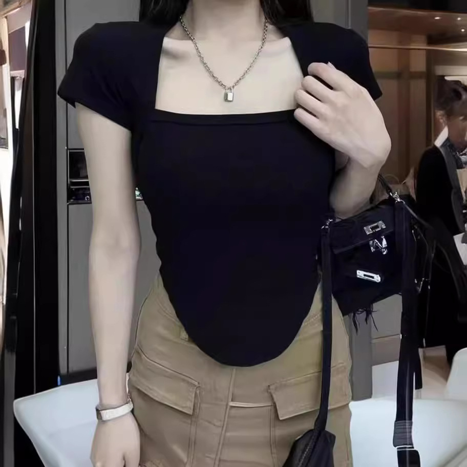 方领短袖T恤女夏新款法式纯欲风辣妹修身螺纹上衣显瘦打底衫.