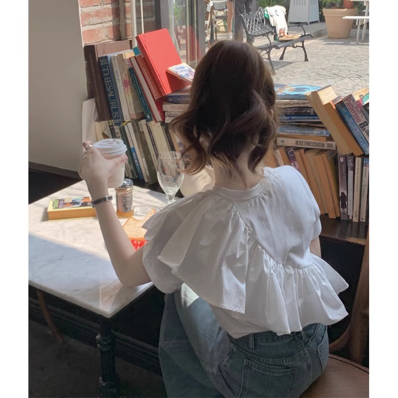 荷叶边短袖纯棉T恤女法式别致独特设计感小众短款上衣夏正肩体恤