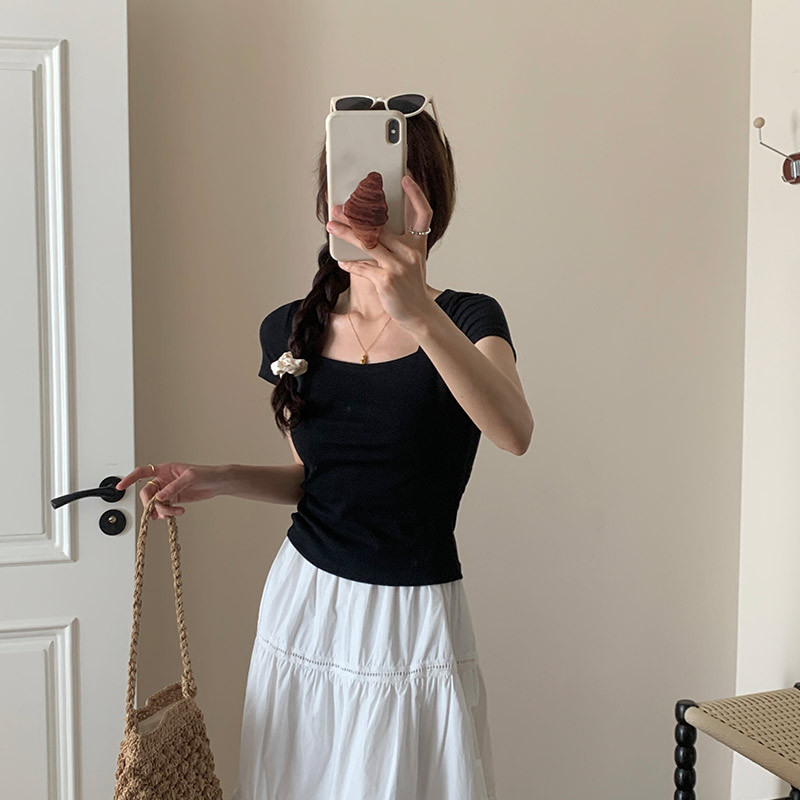 纯欲正肩方领辣妹短袖夏季新款修身显瘦小衫上衣短款t恤女