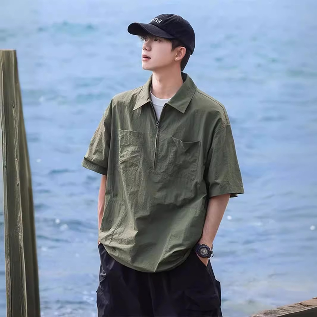 半拉链短袖衬衫男夏季潮牌潮流痞帅日系工装半袖休闲翻领Polo衬衣