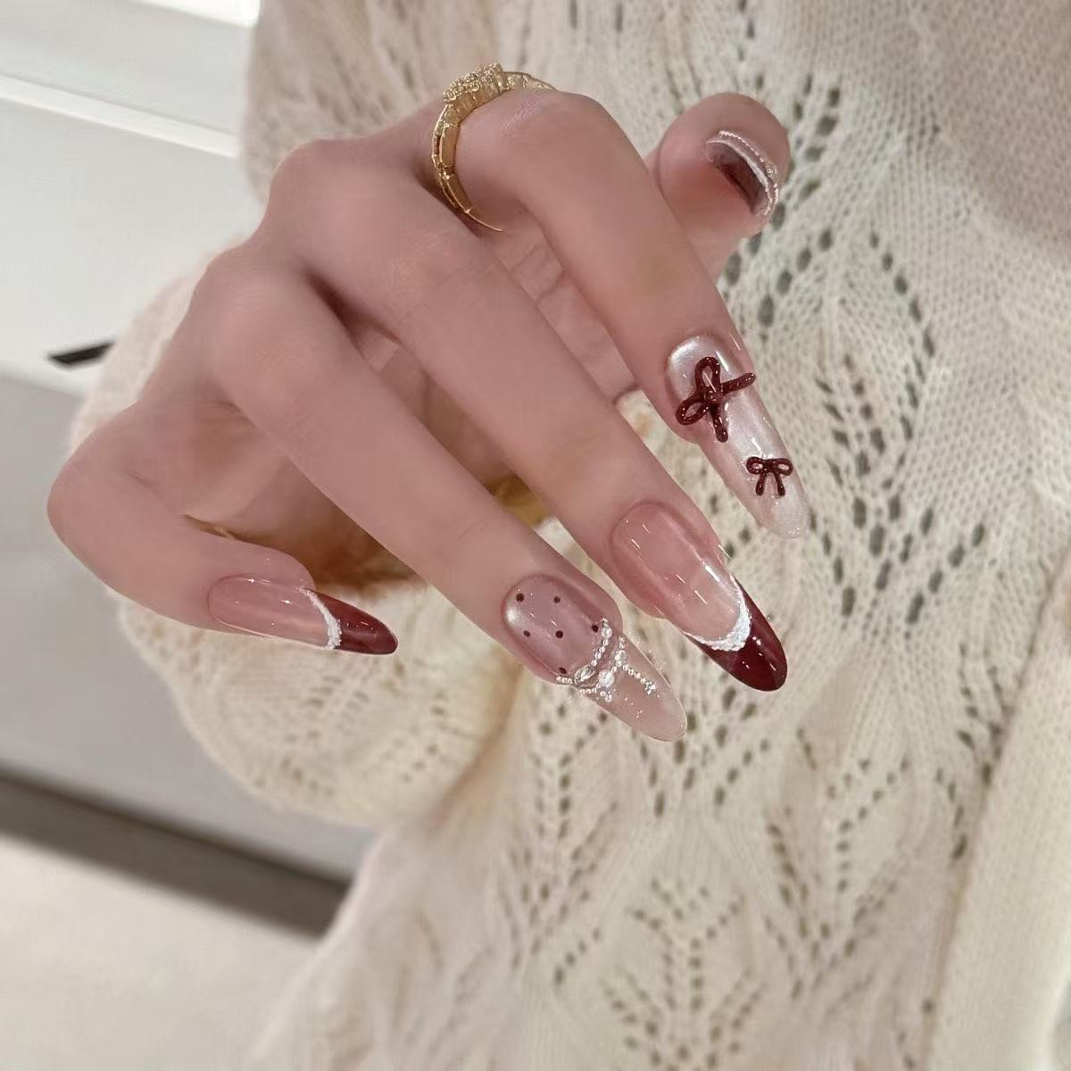 手工穿戴甲秋冬气质显白红色法式甲片波点蝴蝶结百搭圣诞新年美甲