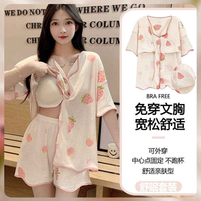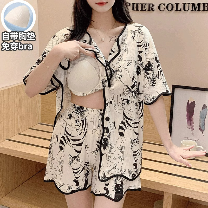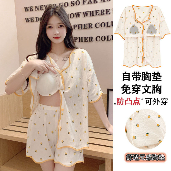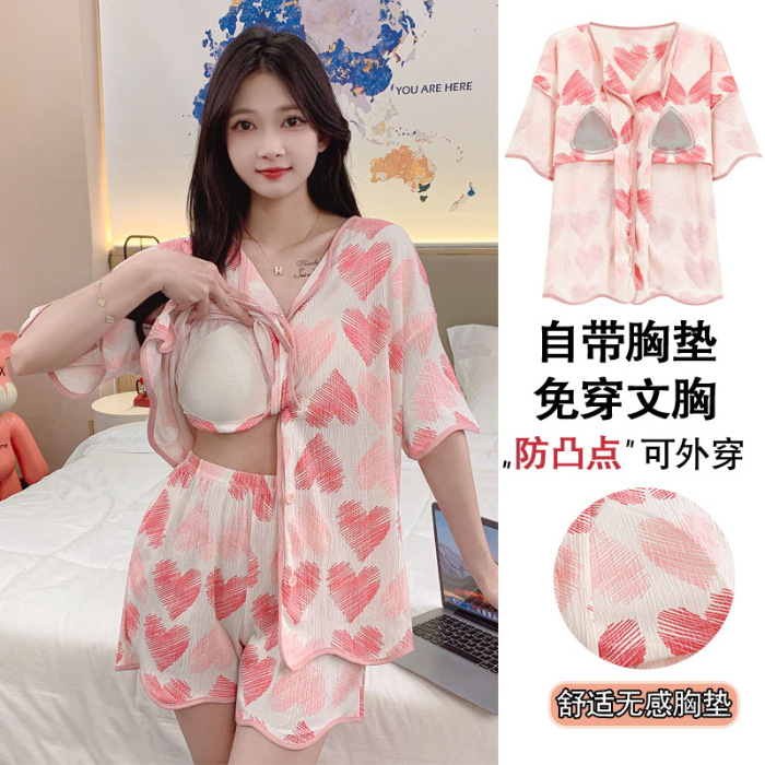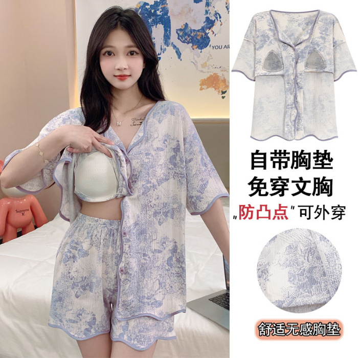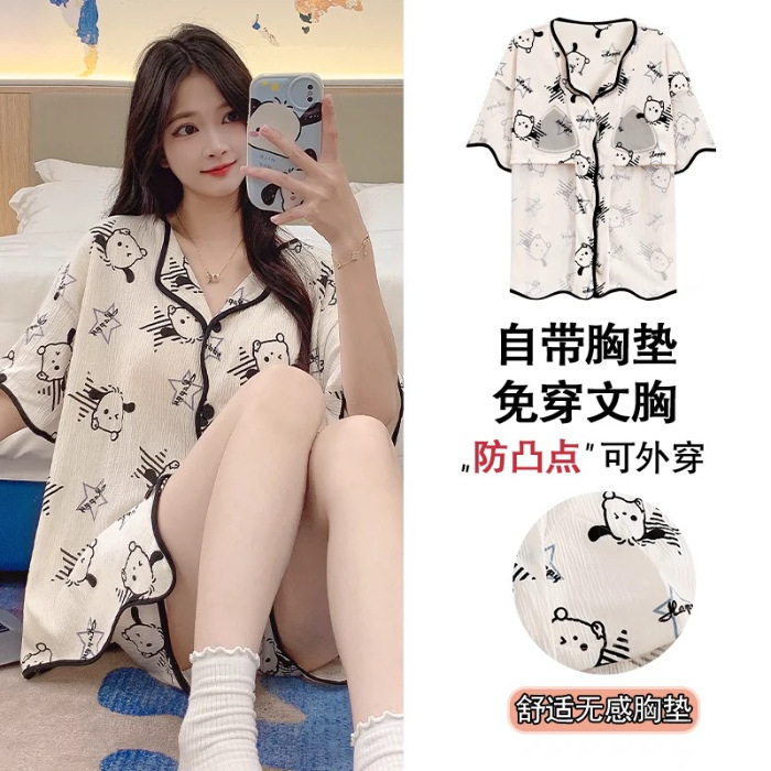 源头工厂带胸垫夏季新款翻领短袖短裤两件套睡衣女家居服可外穿