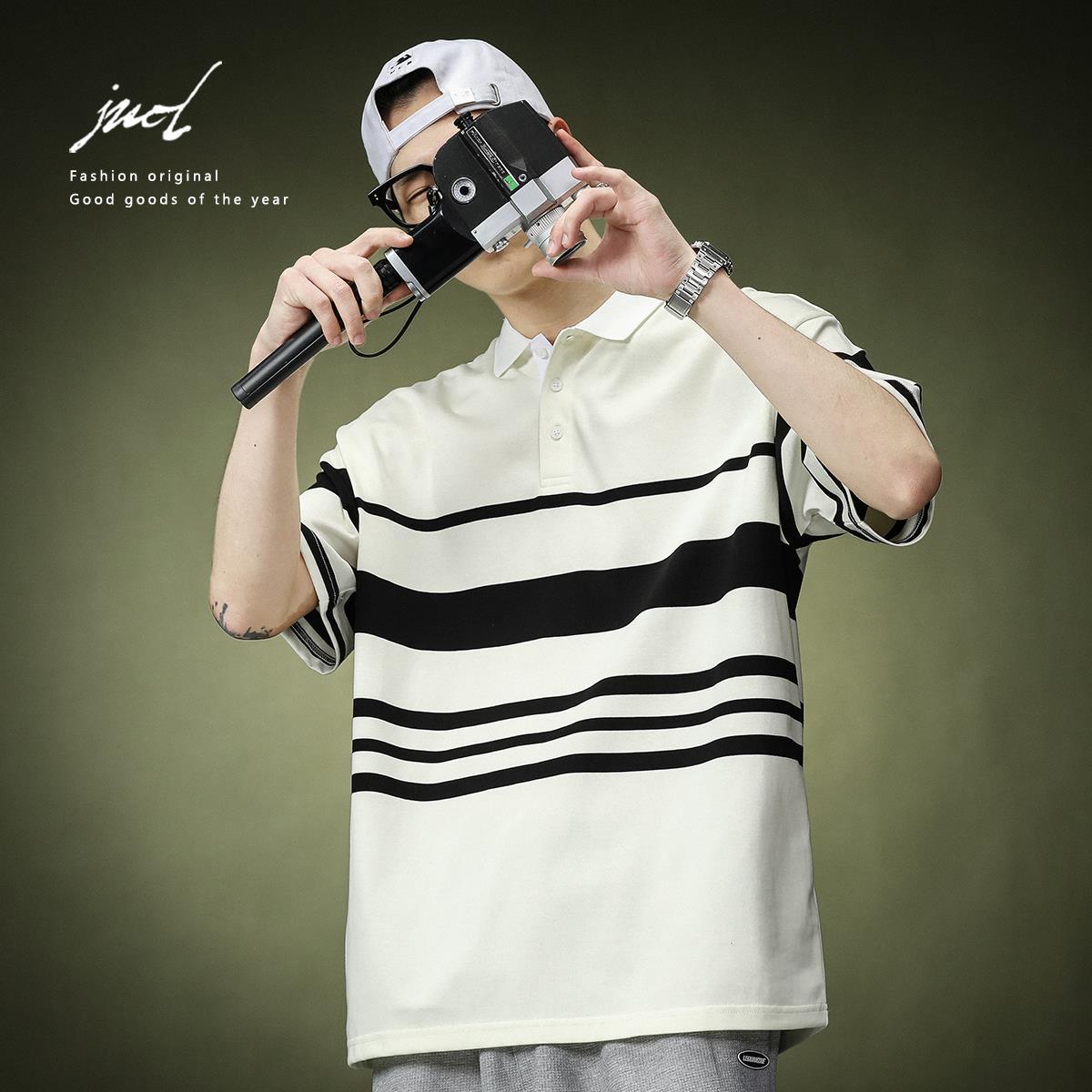 日系经典条纹短袖polo衫T恤男士复古潮流夏季新款ins宽松休闲百搭