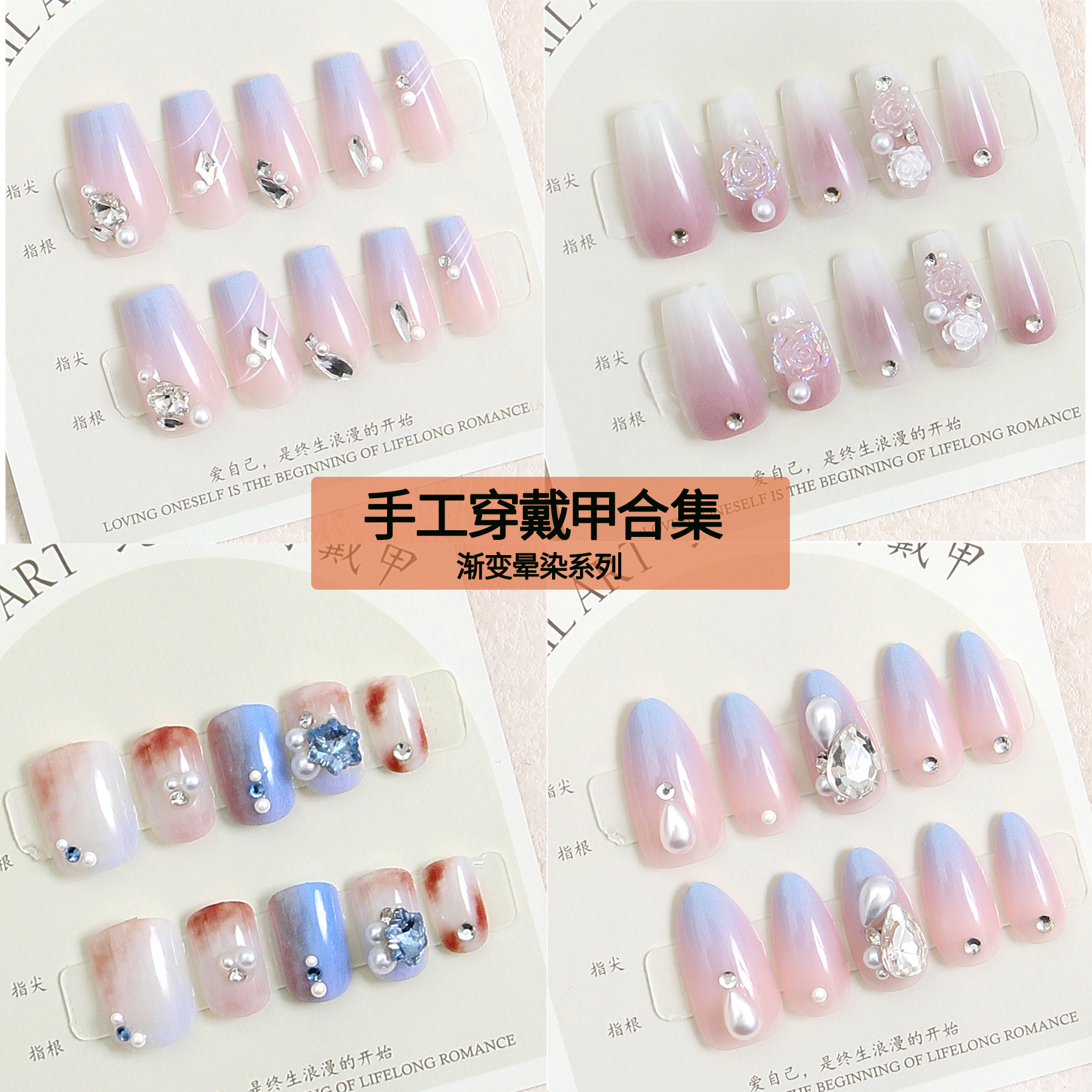 纯手工穿戴甲夏季简约清新美甲片渐变晕染腮红指甲装饰成品假指甲