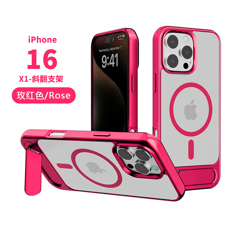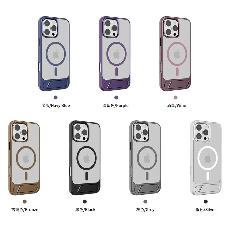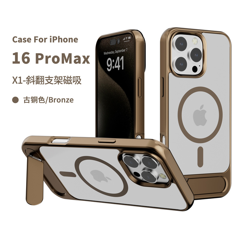 适用iphone16promax金属漆肤感磁吸手机壳苹果16斜方支架手机套