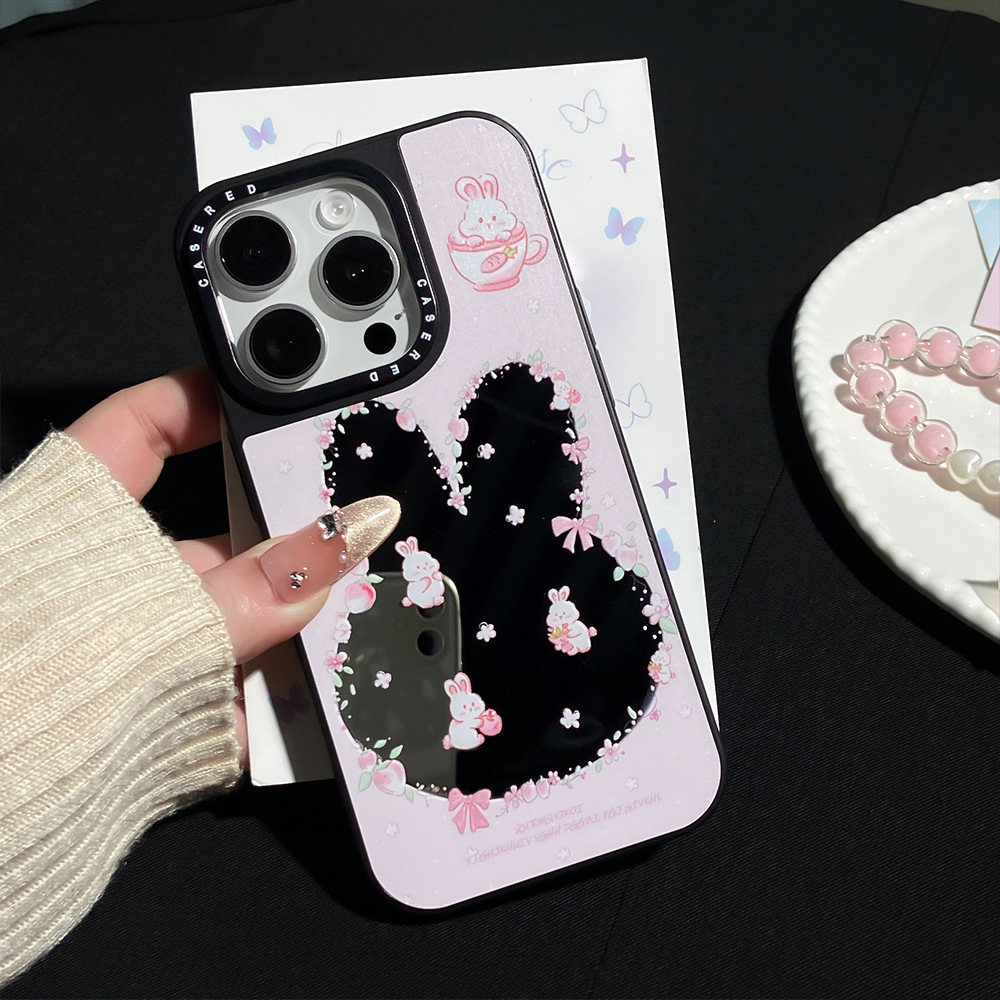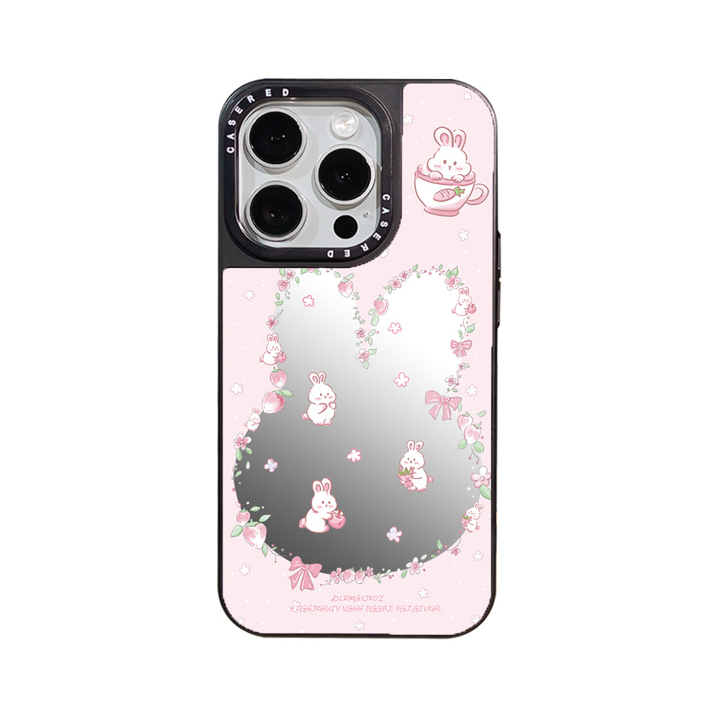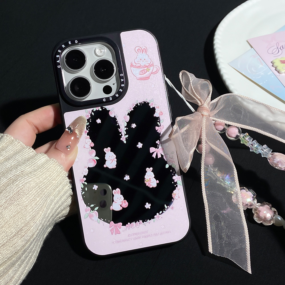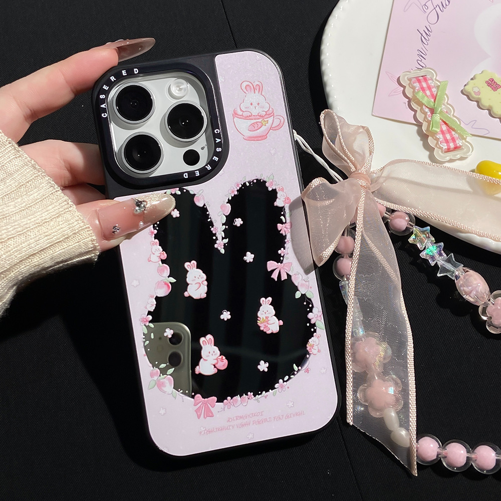 适用苹果16promax手机壳iphone15/13少女镂空镜面粉草莓兔带手链