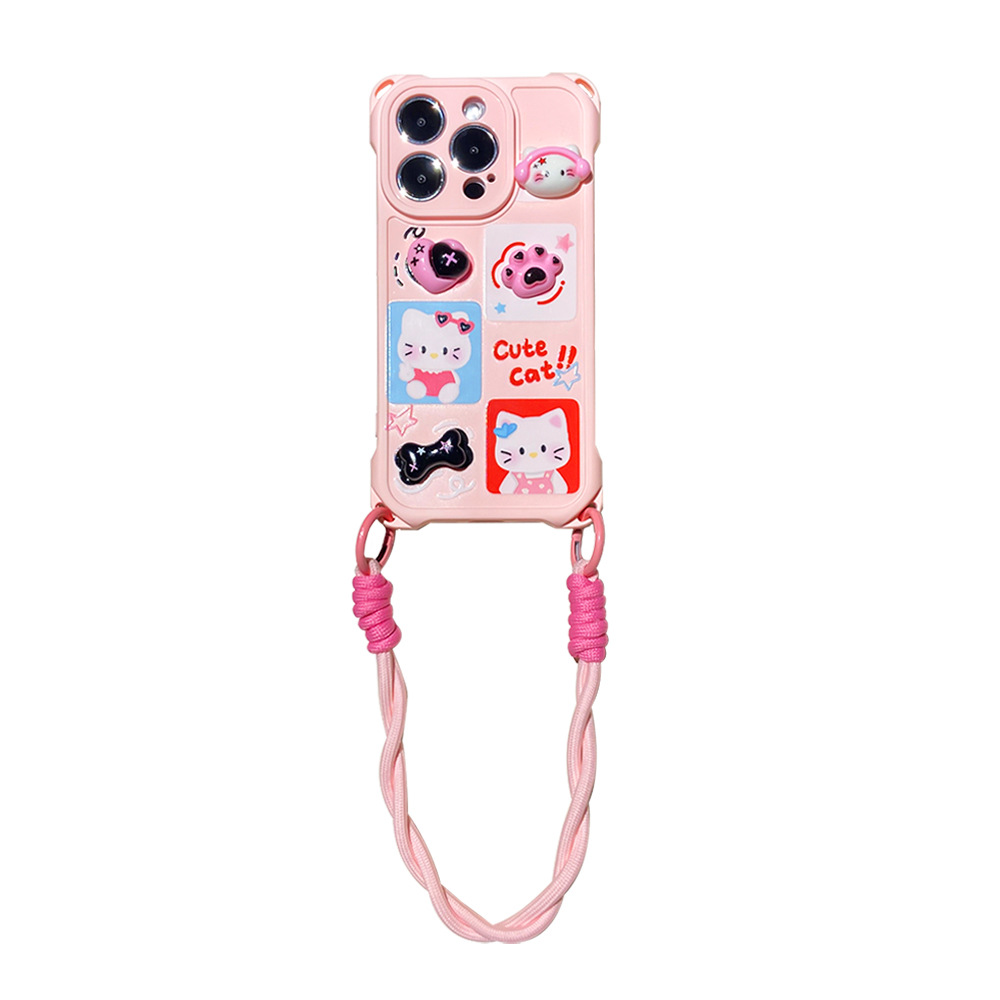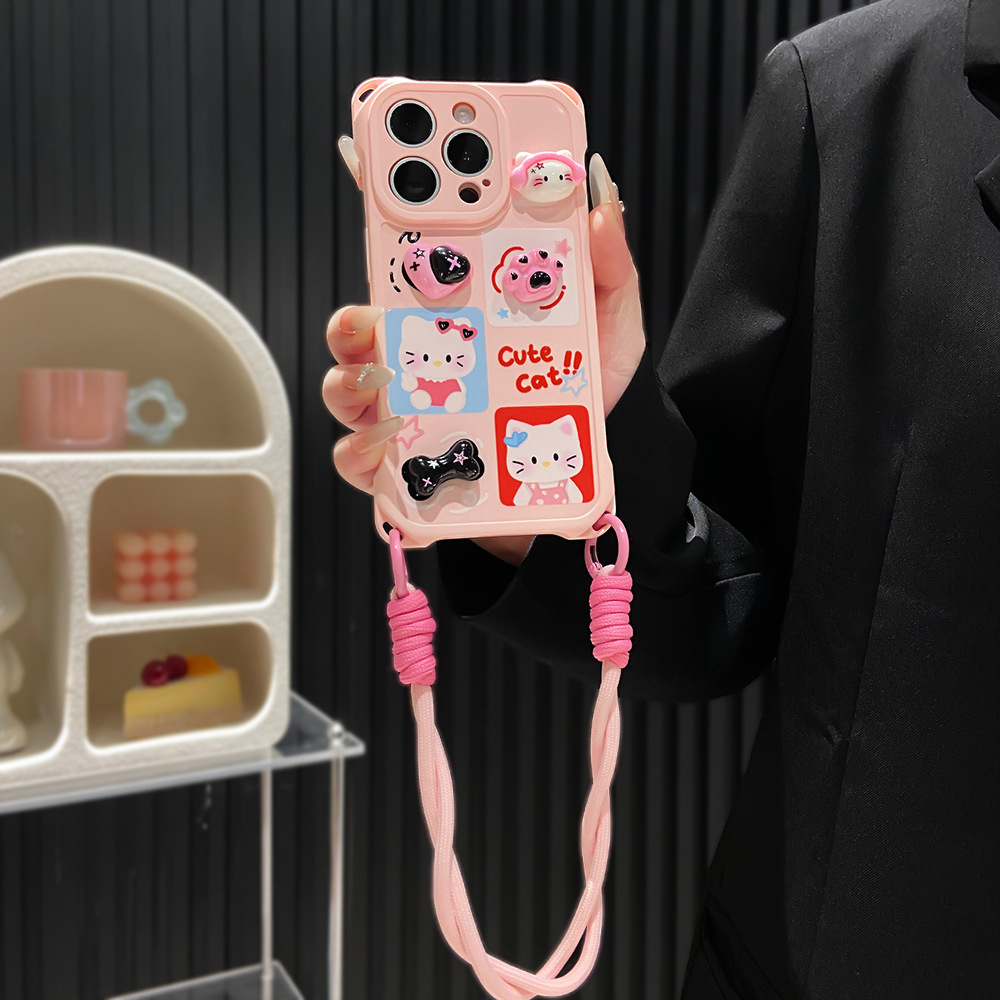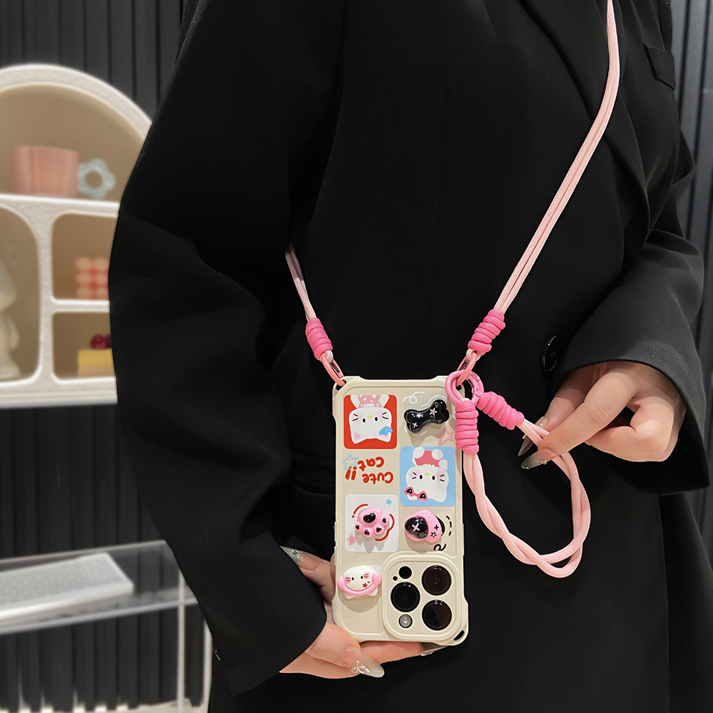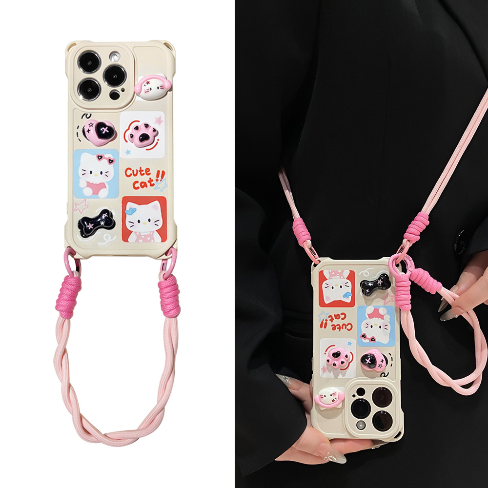 卡通猫咪挂绳适用苹果16Pro/15手机壳iPhone14/13斜跨防摔壳女款
