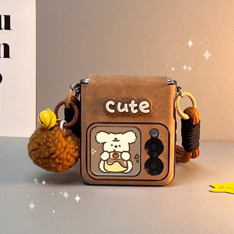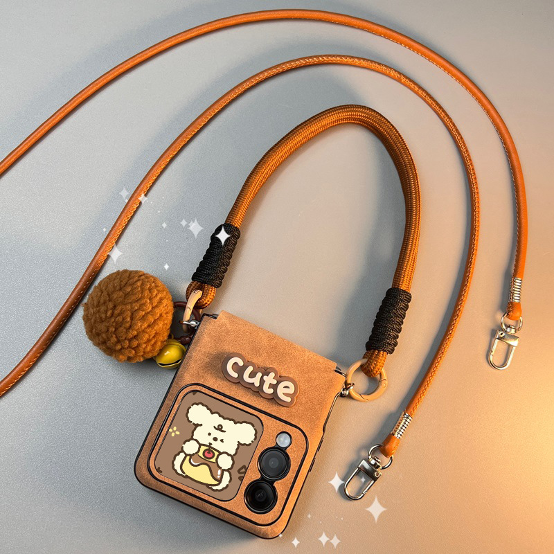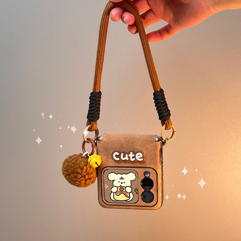 【铰链全包】棕色翻毛皮壳+铃铛挂件+黑棕编织绳+斜挎