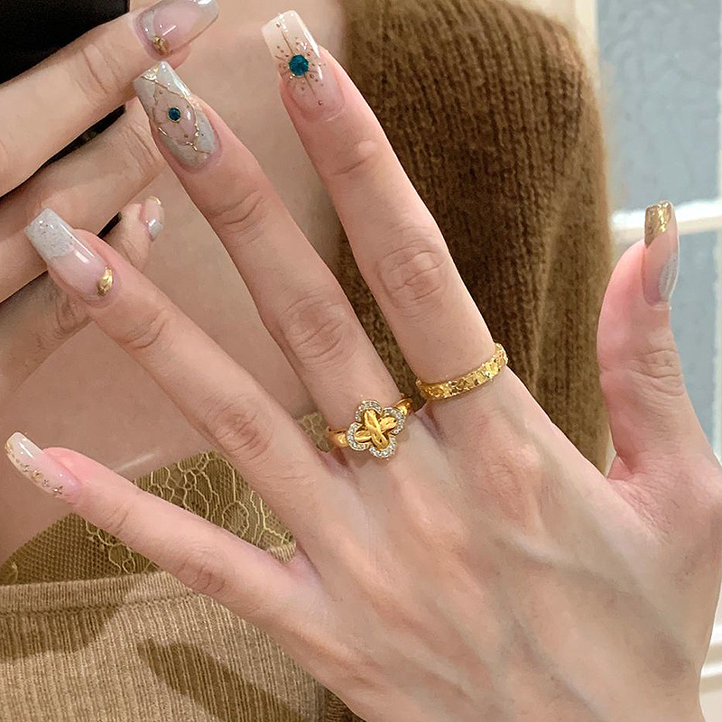 小红书爆款古法拉丝藤蔓四叶花戒指超重工金色满钻爆闪精致指环女