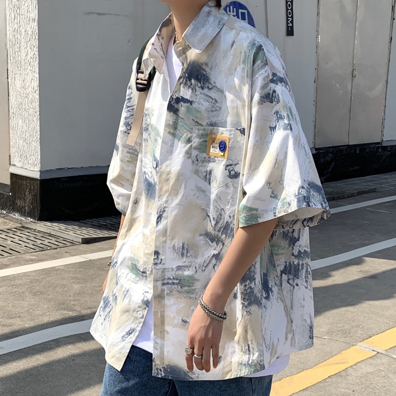 原宿风衬衫夏季新款设计感情侣口袋油画短袖日系港风ins衬衣开衫