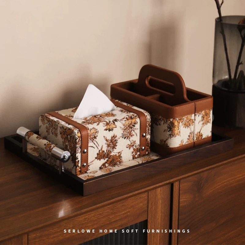 复古金丝提花纸巾盒酒店民宿高档软装皮革铆钉抽纸盒摆件桌面收纳