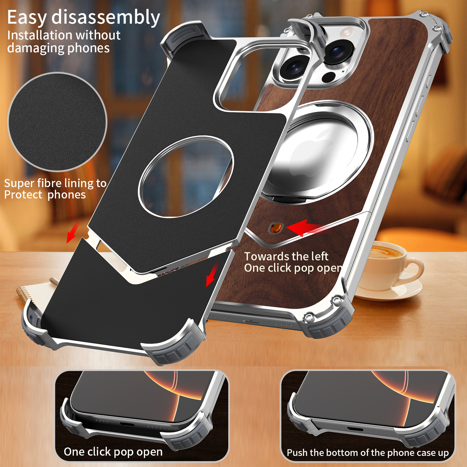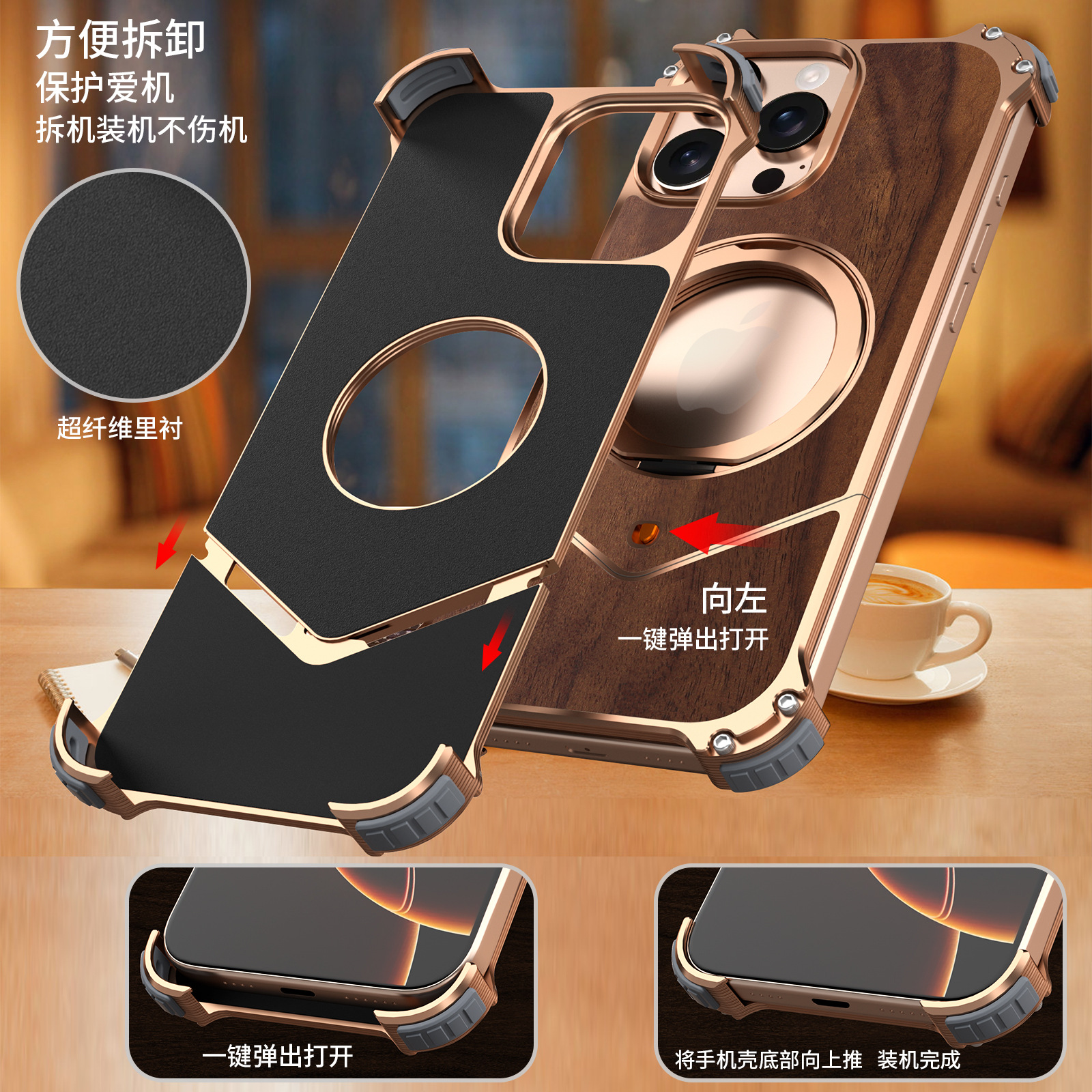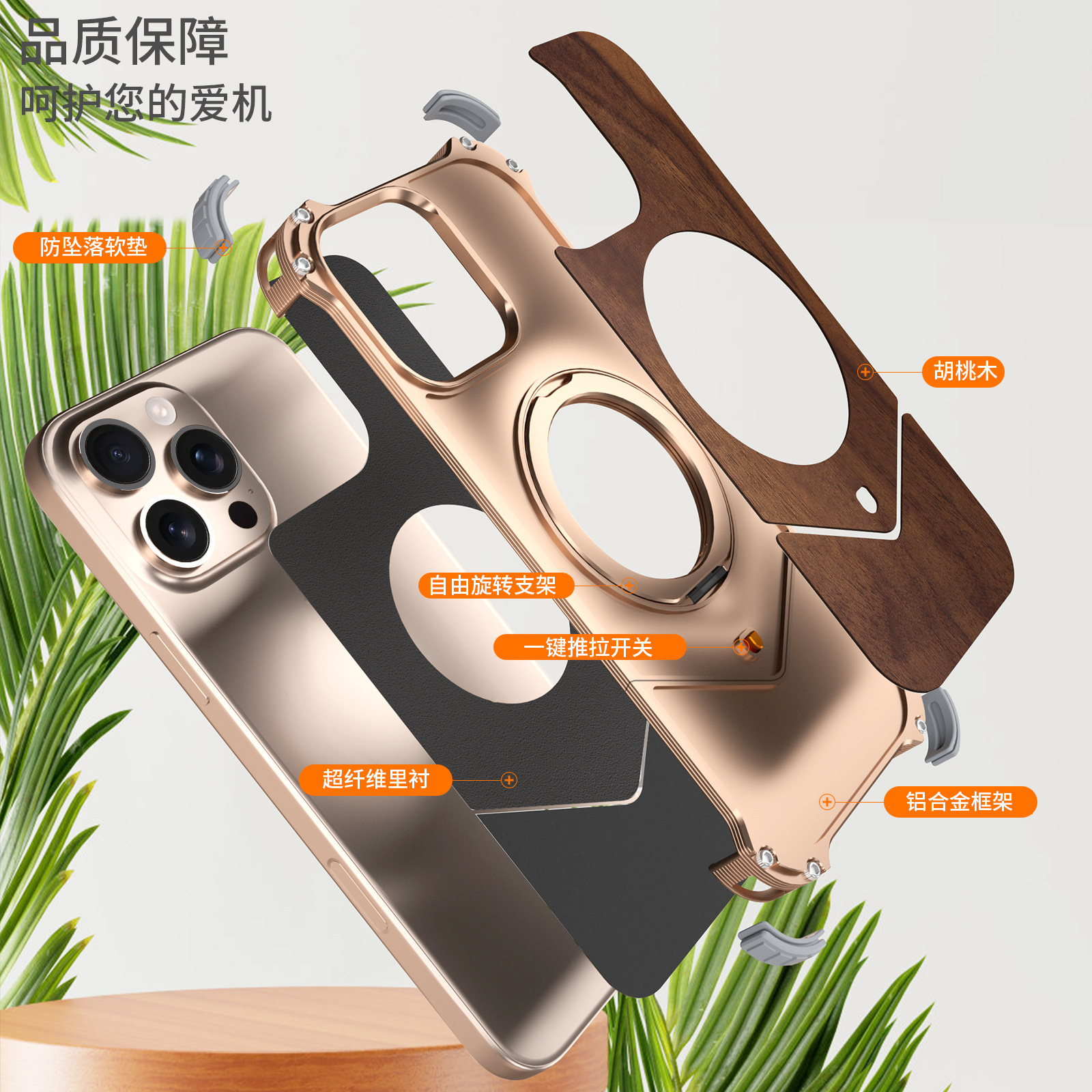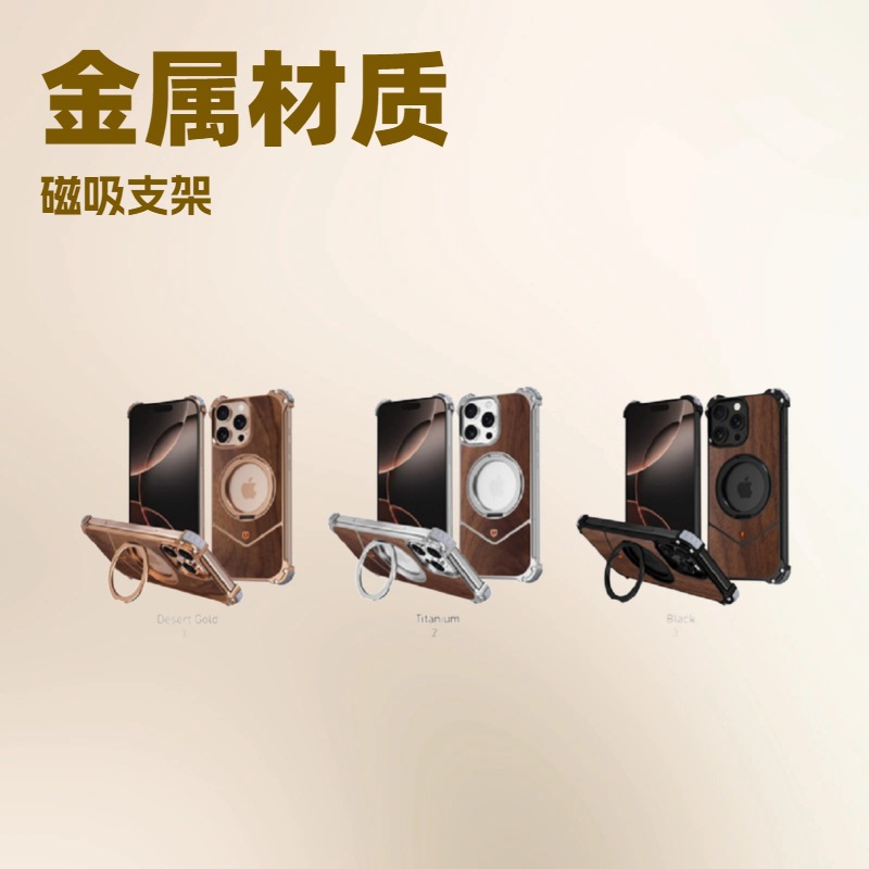 高端防摔金属+原木适用苹果16promax磁吸手机壳S25ULTRA360支架