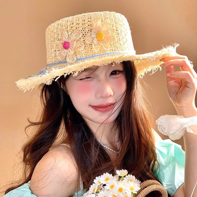 甜美花朵平顶草帽女夏季2025新款海边度假沙滩帽遮阳防晒太阳帽子