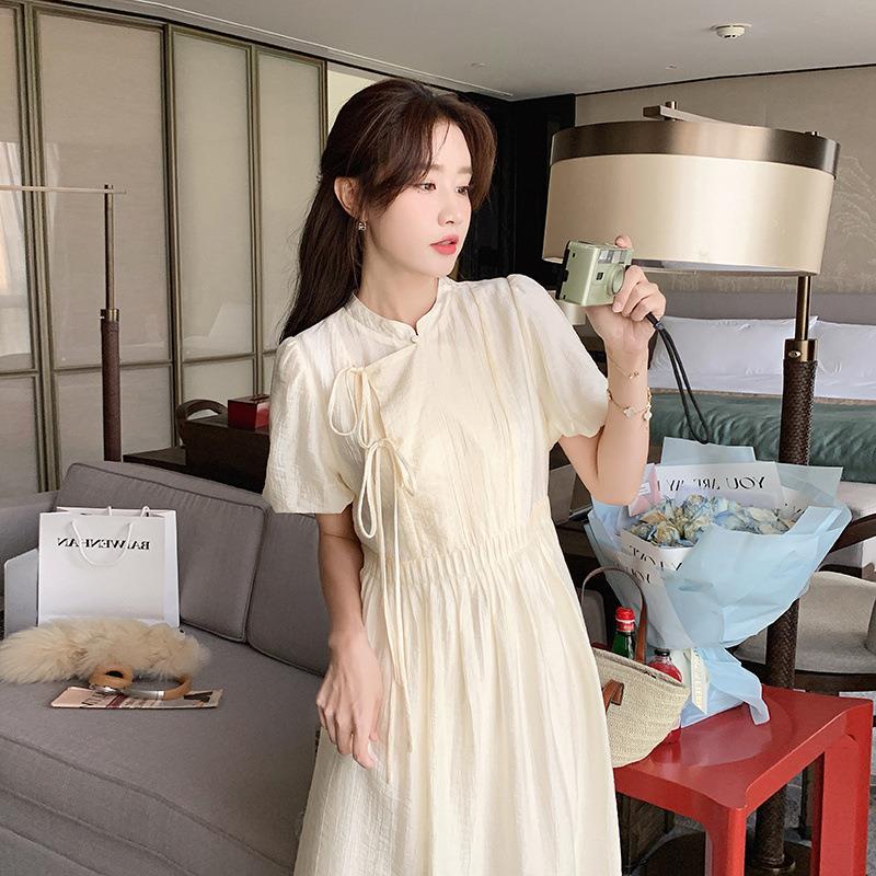 实拍拼接高腰显瘦轻文艺杏色新中式小立领蝴蝶结系带泡泡袖连衣裙