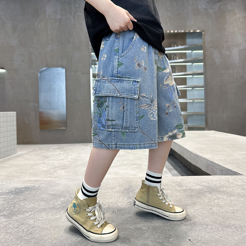 腰果花牛仔短裤男女潮牌宽松休闲五分裤编织抽绳夏季港风百搭中裤