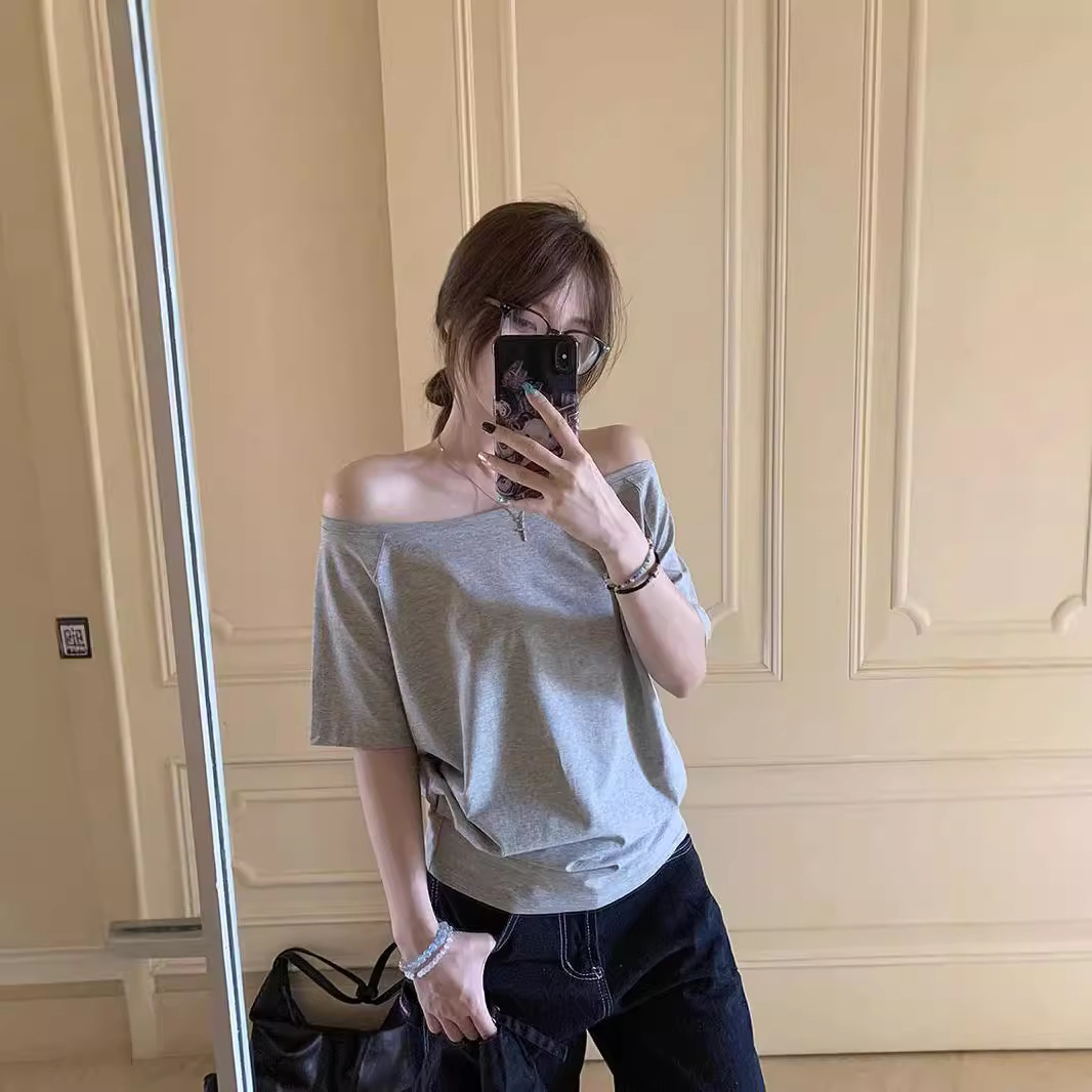 夏季新款一字肩露肩百搭减龄不撞款外穿辣妹女高级感灰色上衣