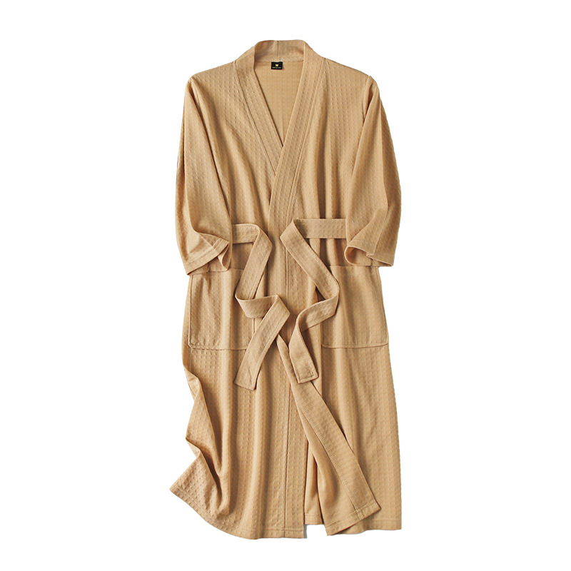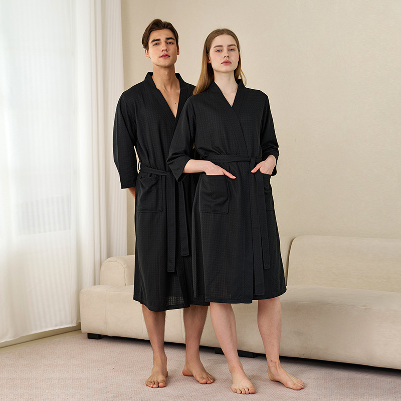 夏季薄款华夫格情侣黑色浴袍女士大码吸水快干浴衣七分袖