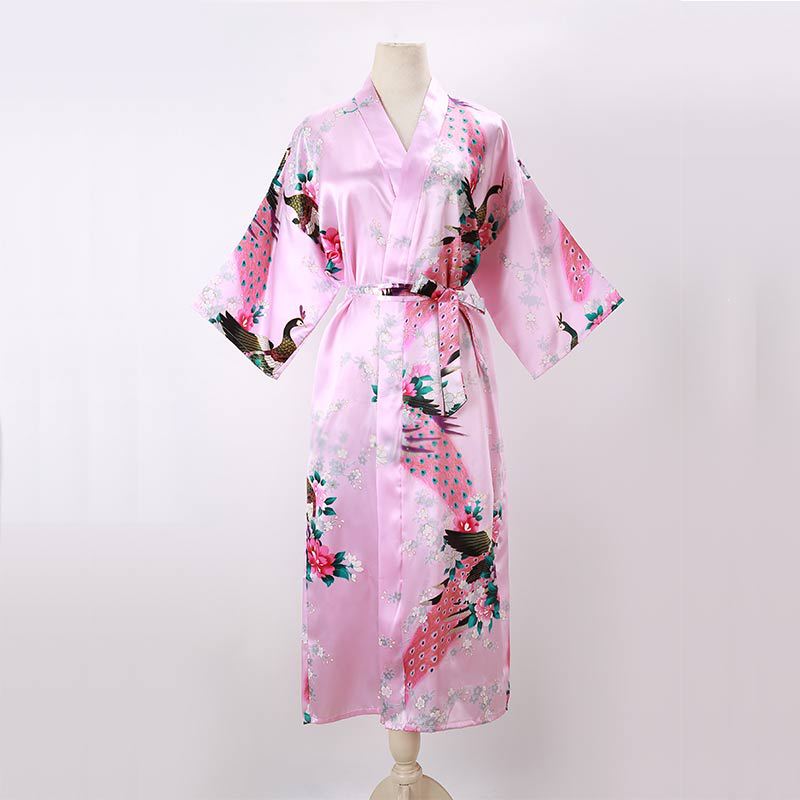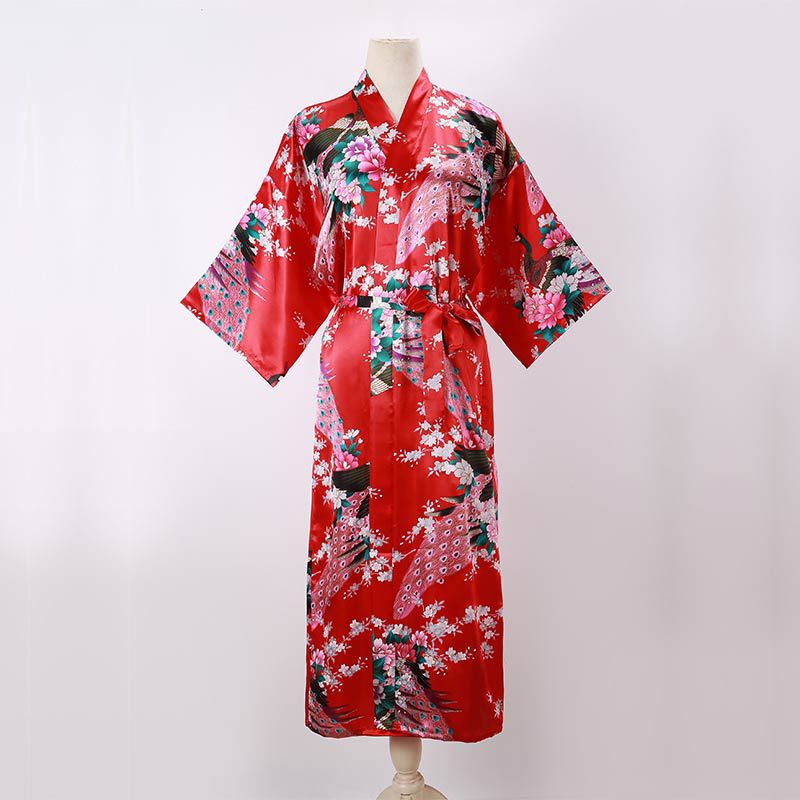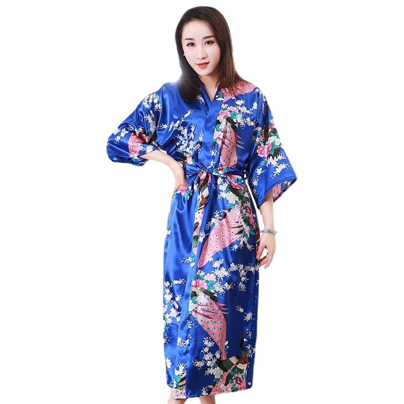 女士性感长款睡衣夏季和服袍薄款孔雀印花浴袍仿丝绸和服睡袍