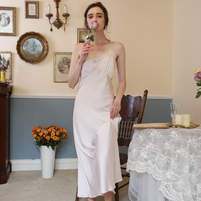 冰丝绸长款睡裙女夏法式复古薄款仿真丝吊带裙睡袍套装