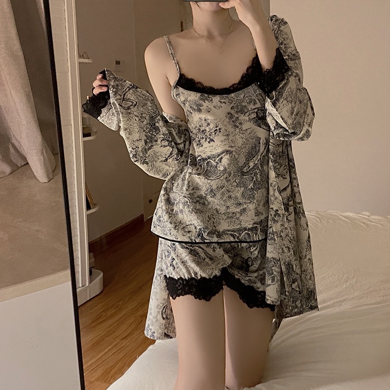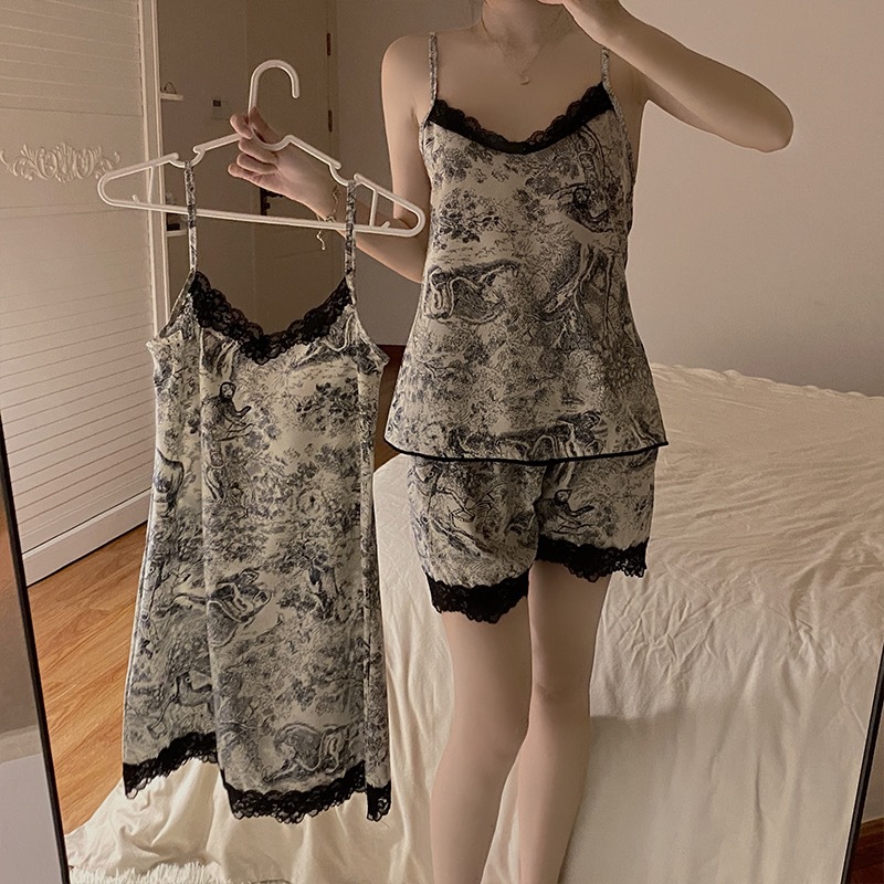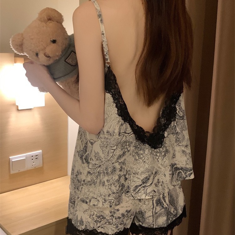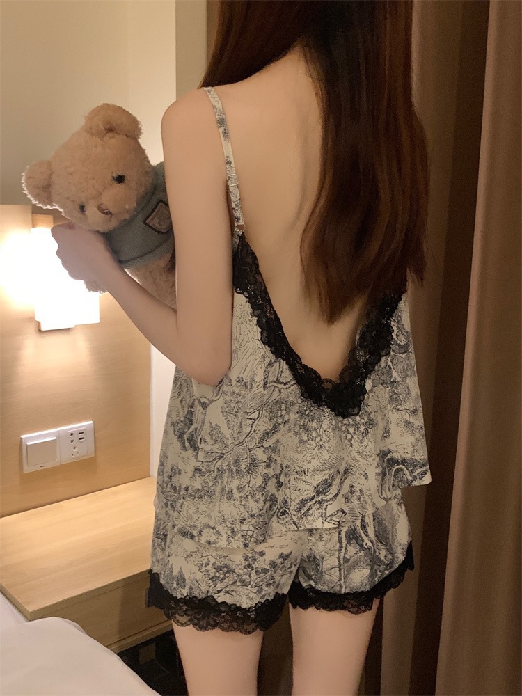 冰丝睡衣女夏季少女纯欲吊带短裤家居服套装睡衣女水墨画性感睡袍