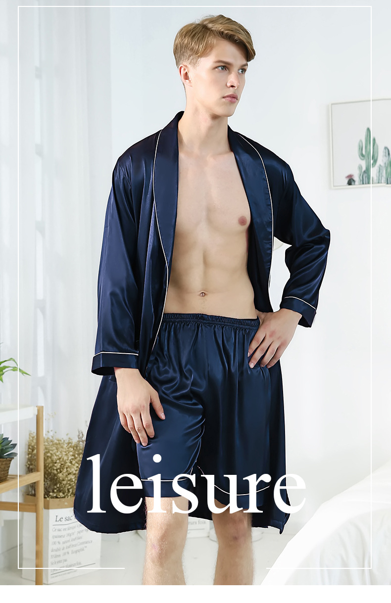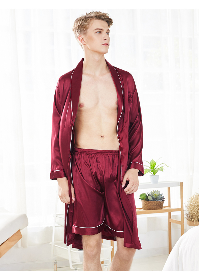 男士冰丝绸睡衣夏季男士青果领睡袍睡裤家居服