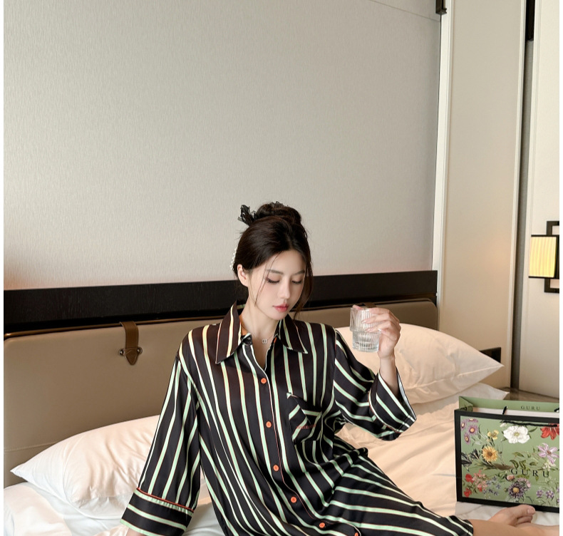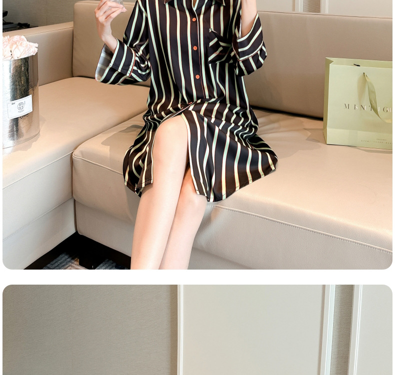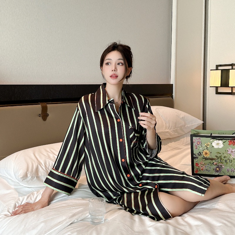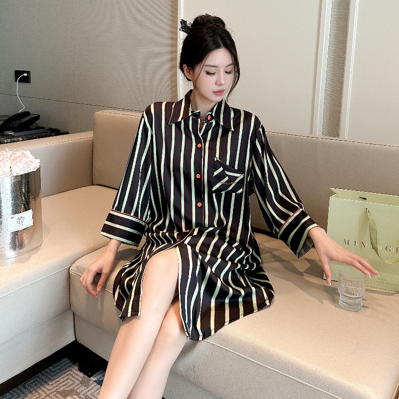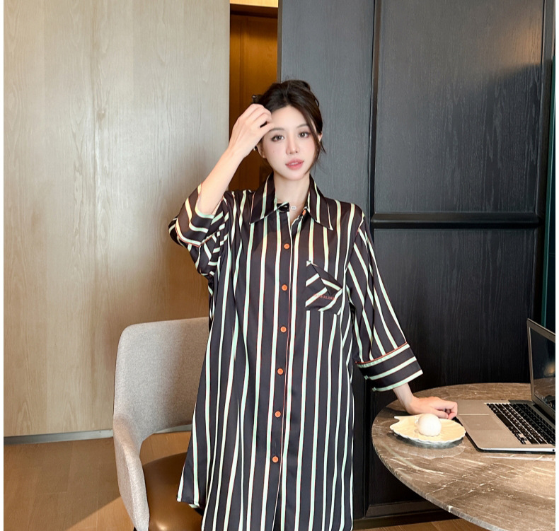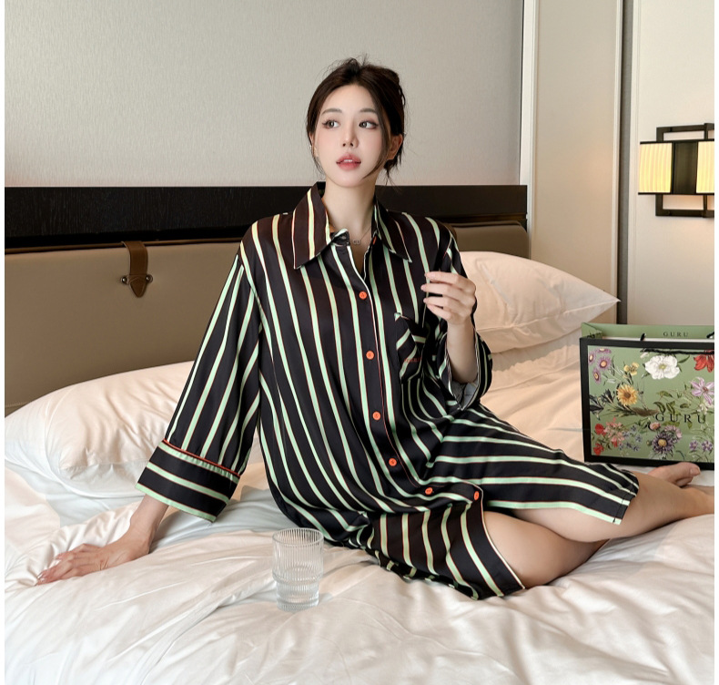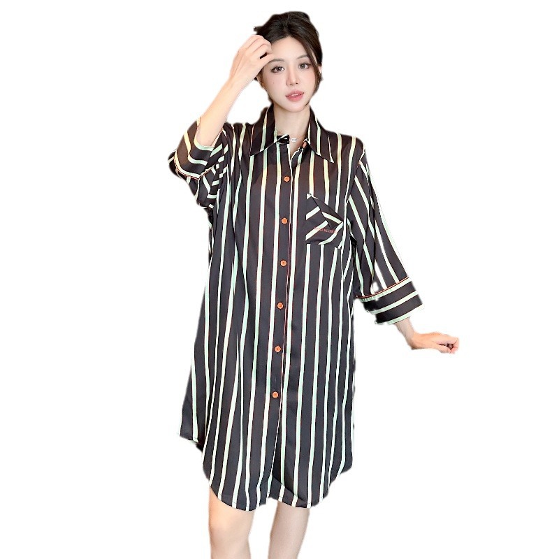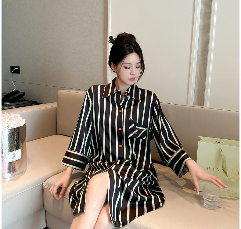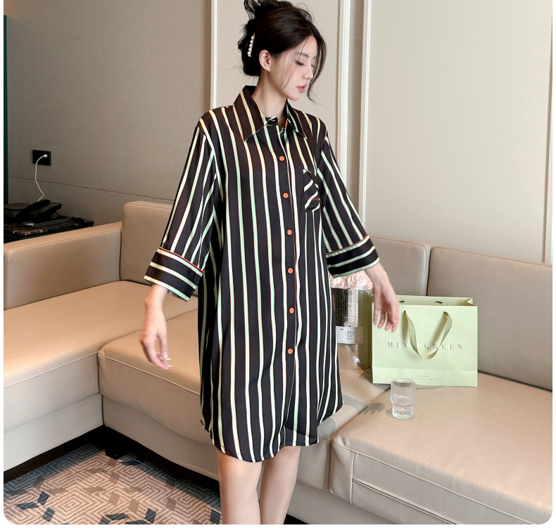 夏季冰丝绸薄款衬衫裙女中长袖高级感绿色条纹睡裙夏天宽松可外穿
