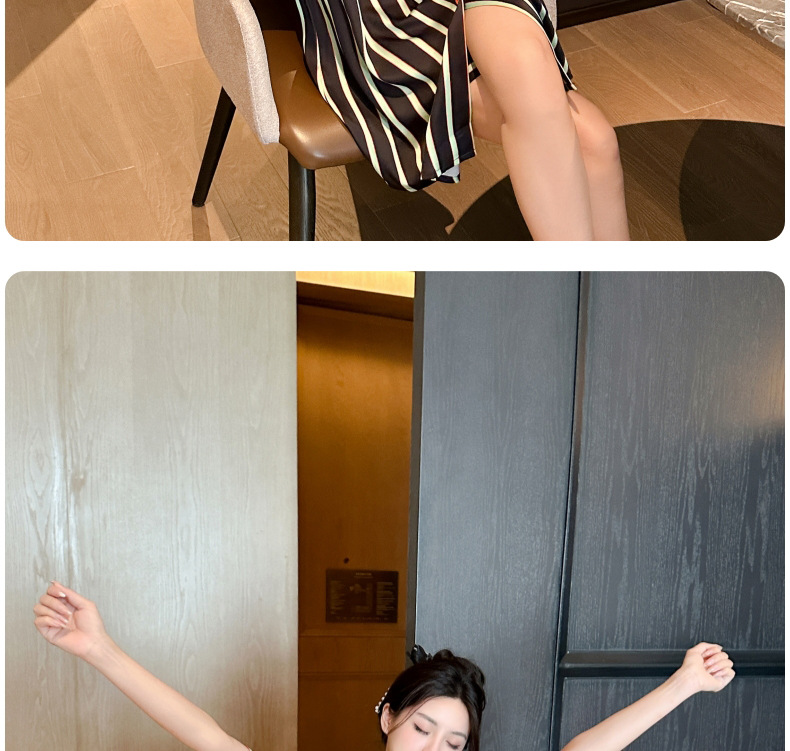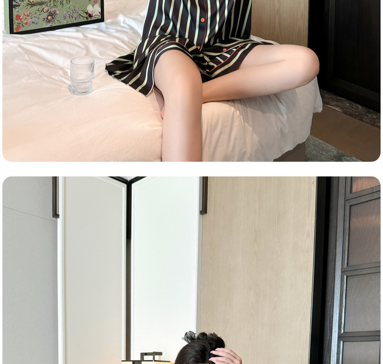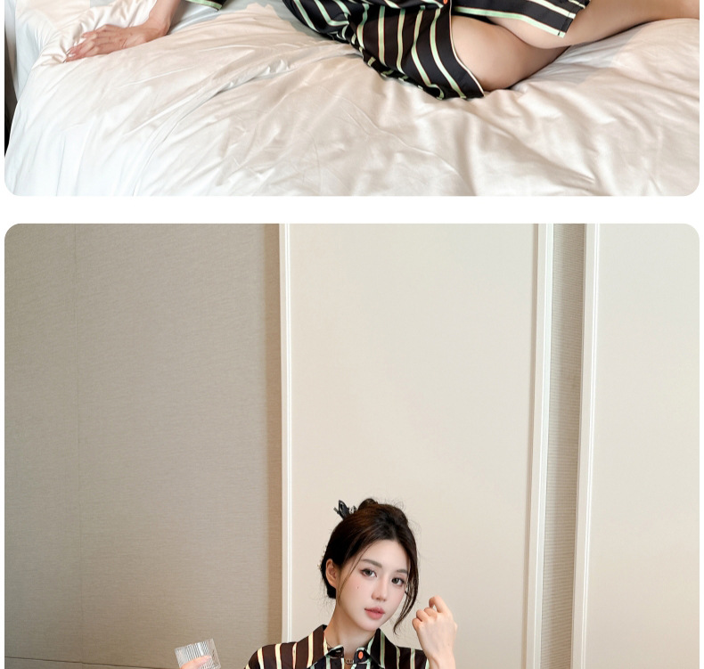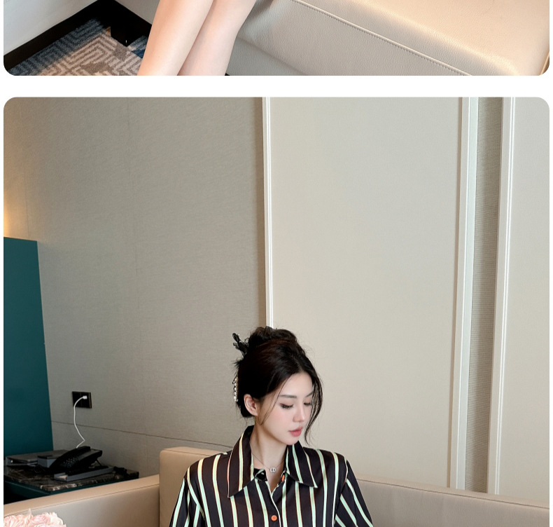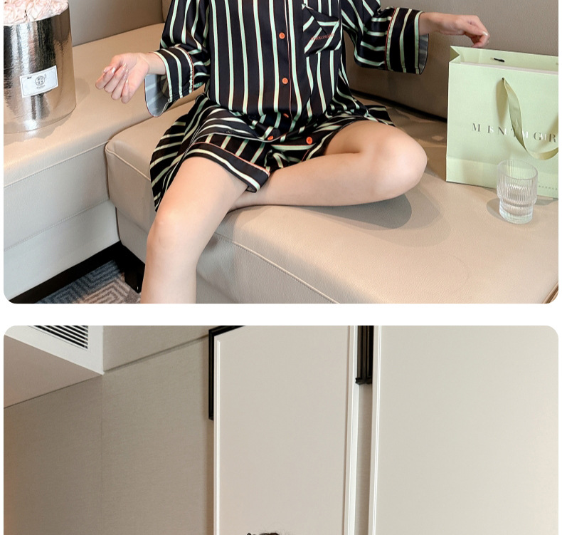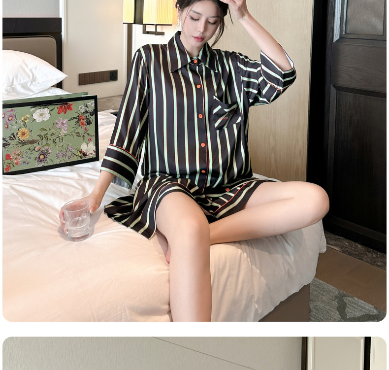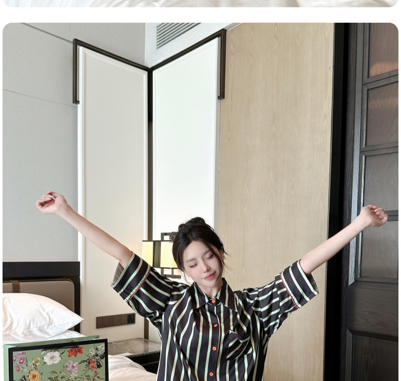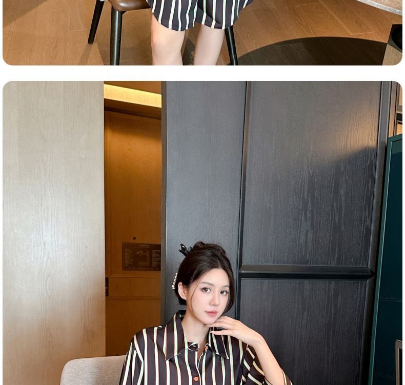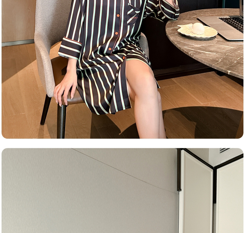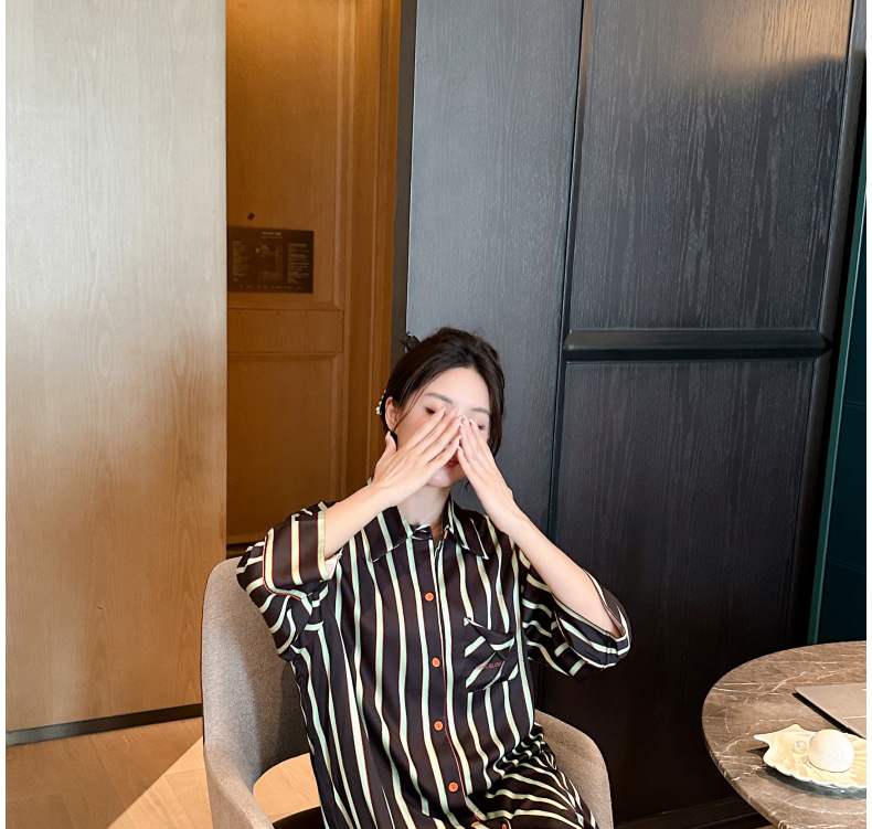 夏季冰丝绸薄款衬衫裙女中长袖高级感绿色条纹睡裙夏天宽松可外穿