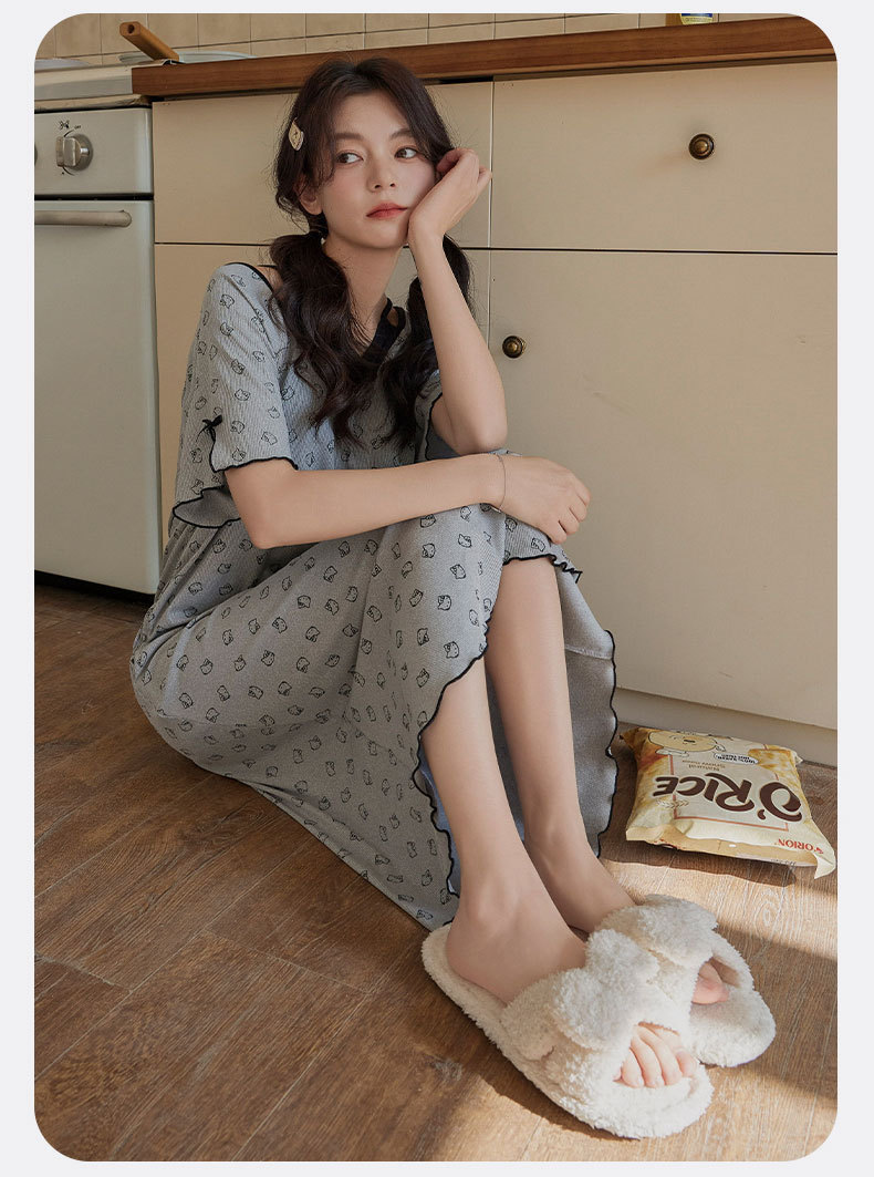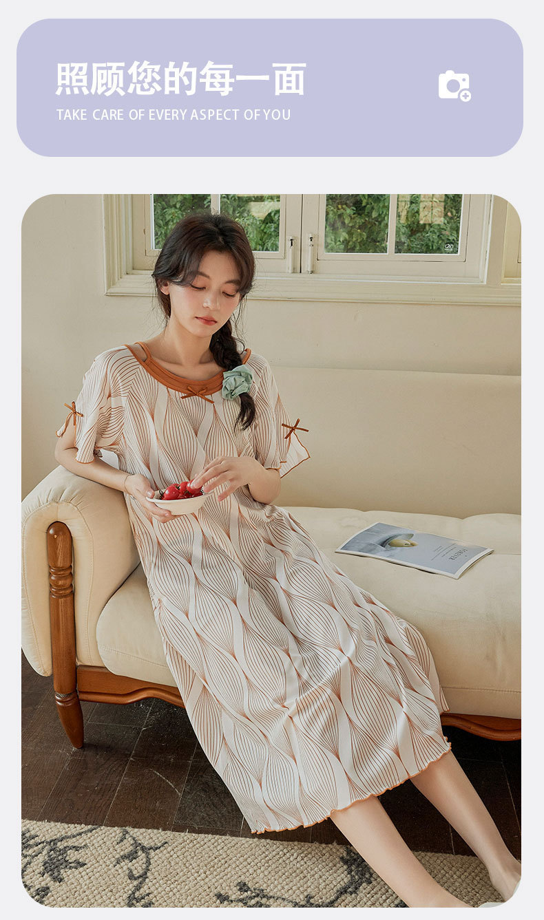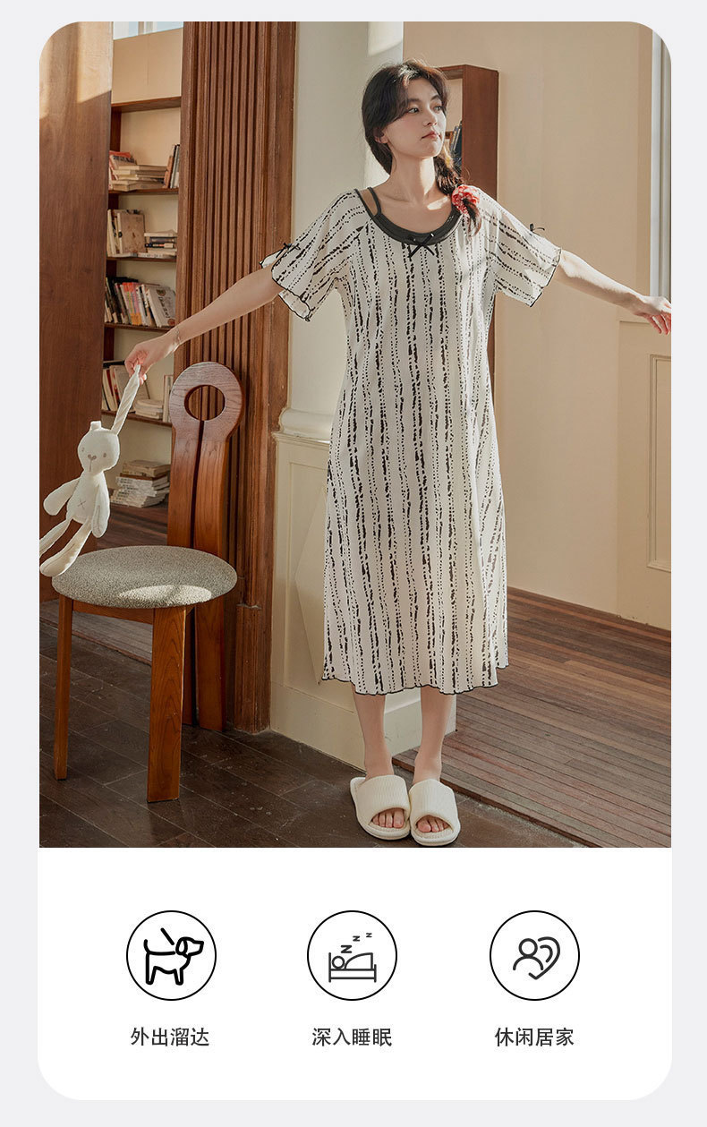 带胸垫假两件睡裙女夏季薄款冰丝高级短袖甜美长款过膝连衣裙