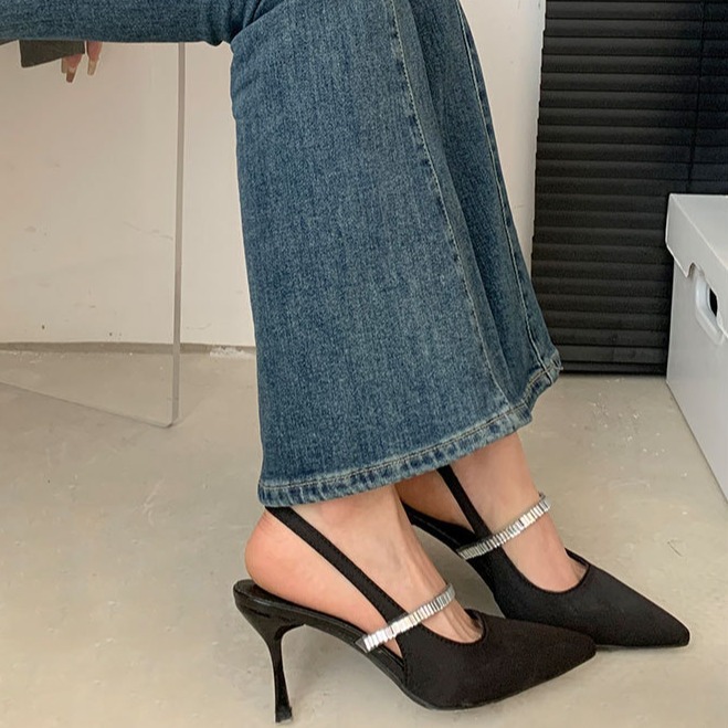 黑色尖头法式复古增高细跟凉鞋女款新款夏季外穿小个子高跟鞋